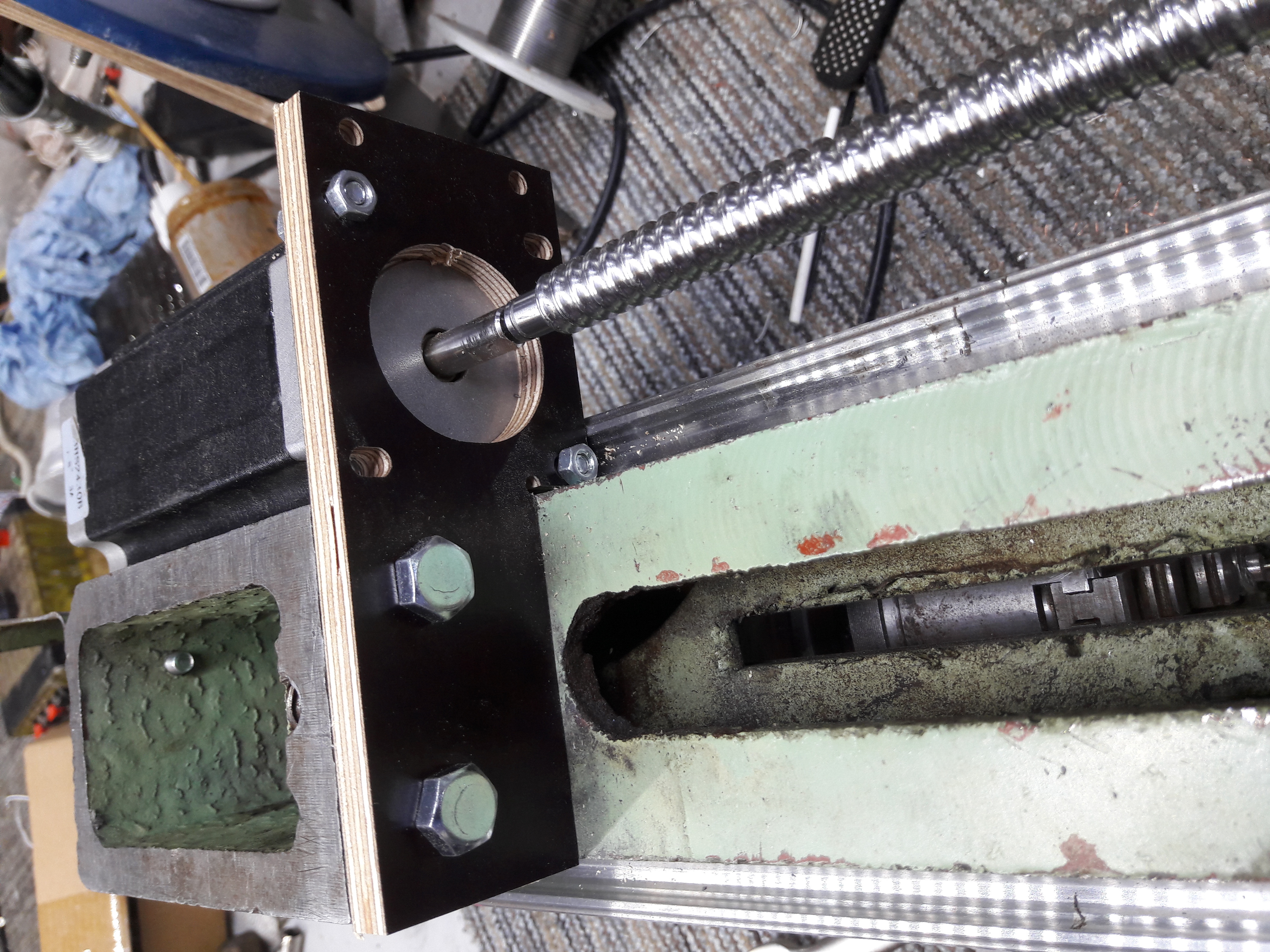 Не спешно начал переставлять "электрогитару" . Станок далеко не супер-пупер ,но мне вроде достался достаточно удачный , сталь режет и даже отрезает , много косяков , материальчик так себе ,задняя бабка хиловатая . С "родной" продольной работать можно ,но это мУка ! Шестерёнки сразу снял в ящик , крутил винт за ручку . И вот теперь поставил ШВП и вот он кайф ! Шаговики ,шкивы и ремни это пока макетирование , а то некоторые подумали ,что я станок из ламината строю ! :hehehe:
