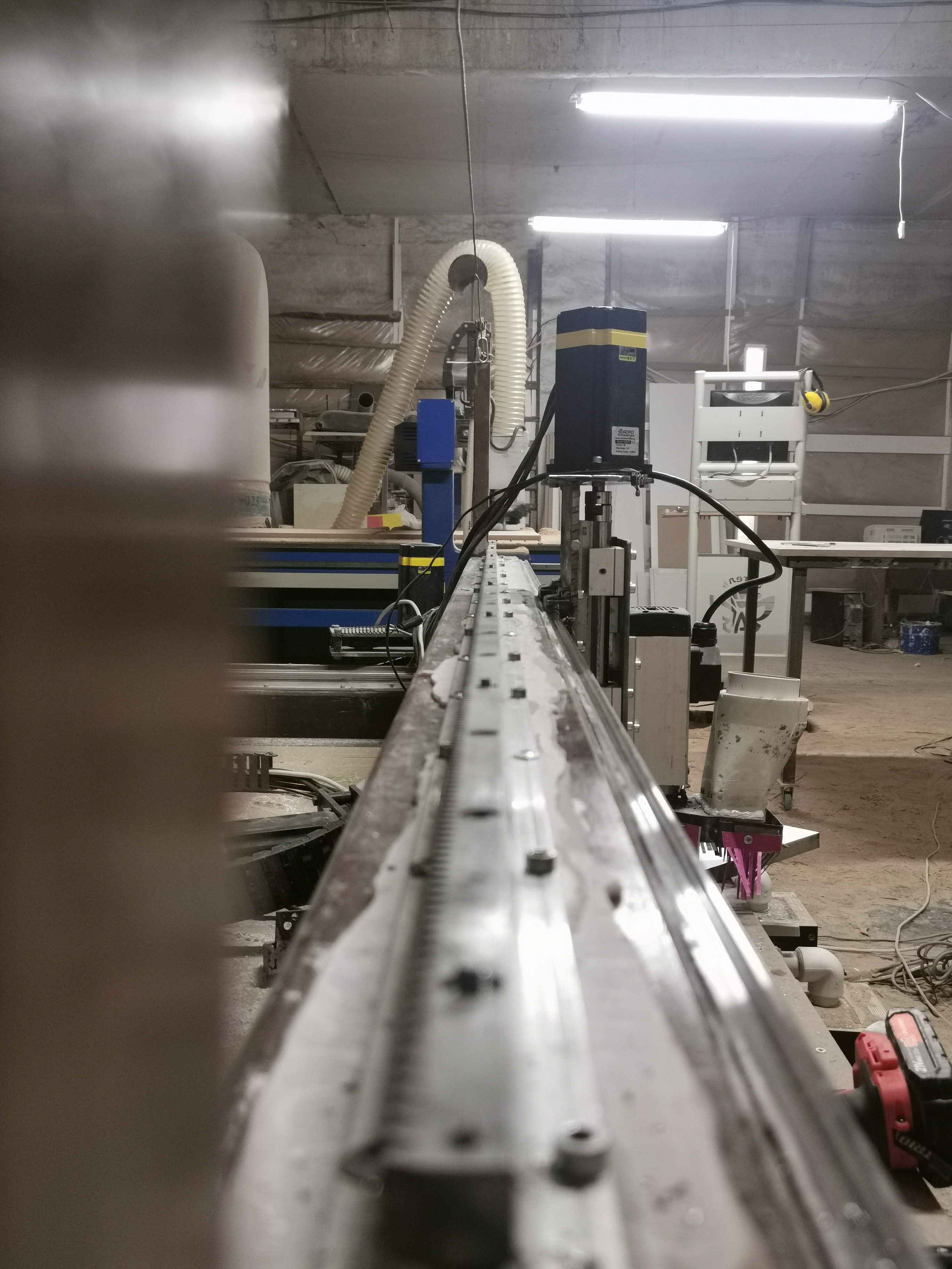 Итак, в итоге выровнял портал: залил эпоксидкой, на каретки повесил угол, сверху ручной фрезер и сфрезеровал до ровного. Потом с круглой рельсы снял направляющую и поставил туда зубчатую рейку. Через леску и валики выровнял в вертикальной плоскости. Проверил горизонт, в центре 3 десятых изгиб. Проверил рельсы - там также.