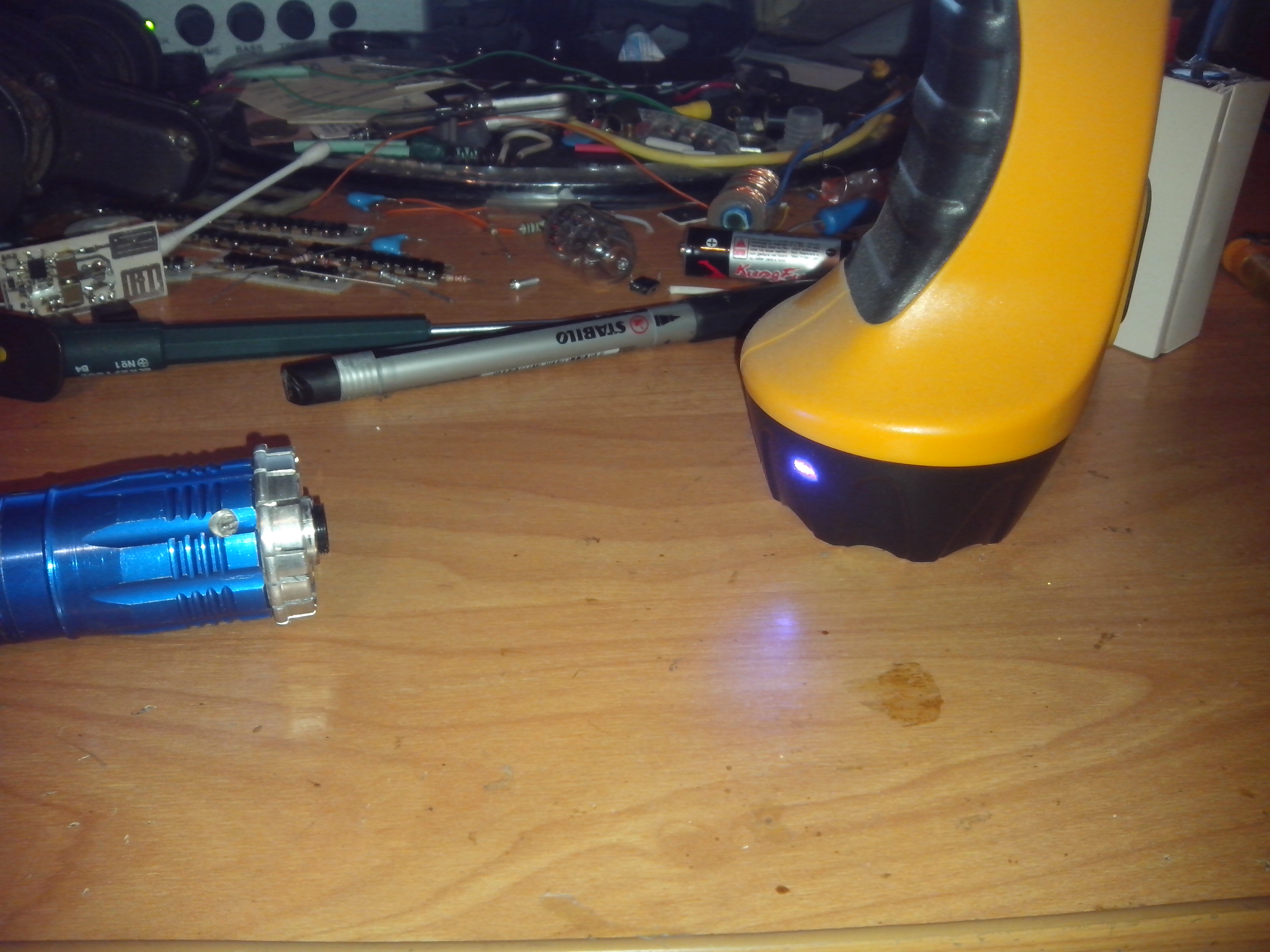Вот к примеру. На фото пятно 405нм лазера на черном и желтом пластике. Желтый пластик светится ослепительно ярким белым светом.