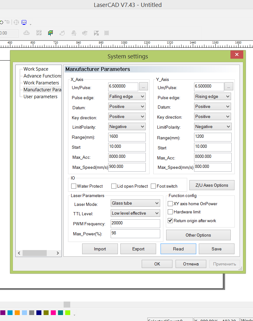 Подскажите, как в контролере AWC 608 настроить размеры рабочего поля? По умолчанию стоит 1200*900, не могу сообразить где это в настройках можно поменять, вроде все излазил. Или нужно перепрошивать?