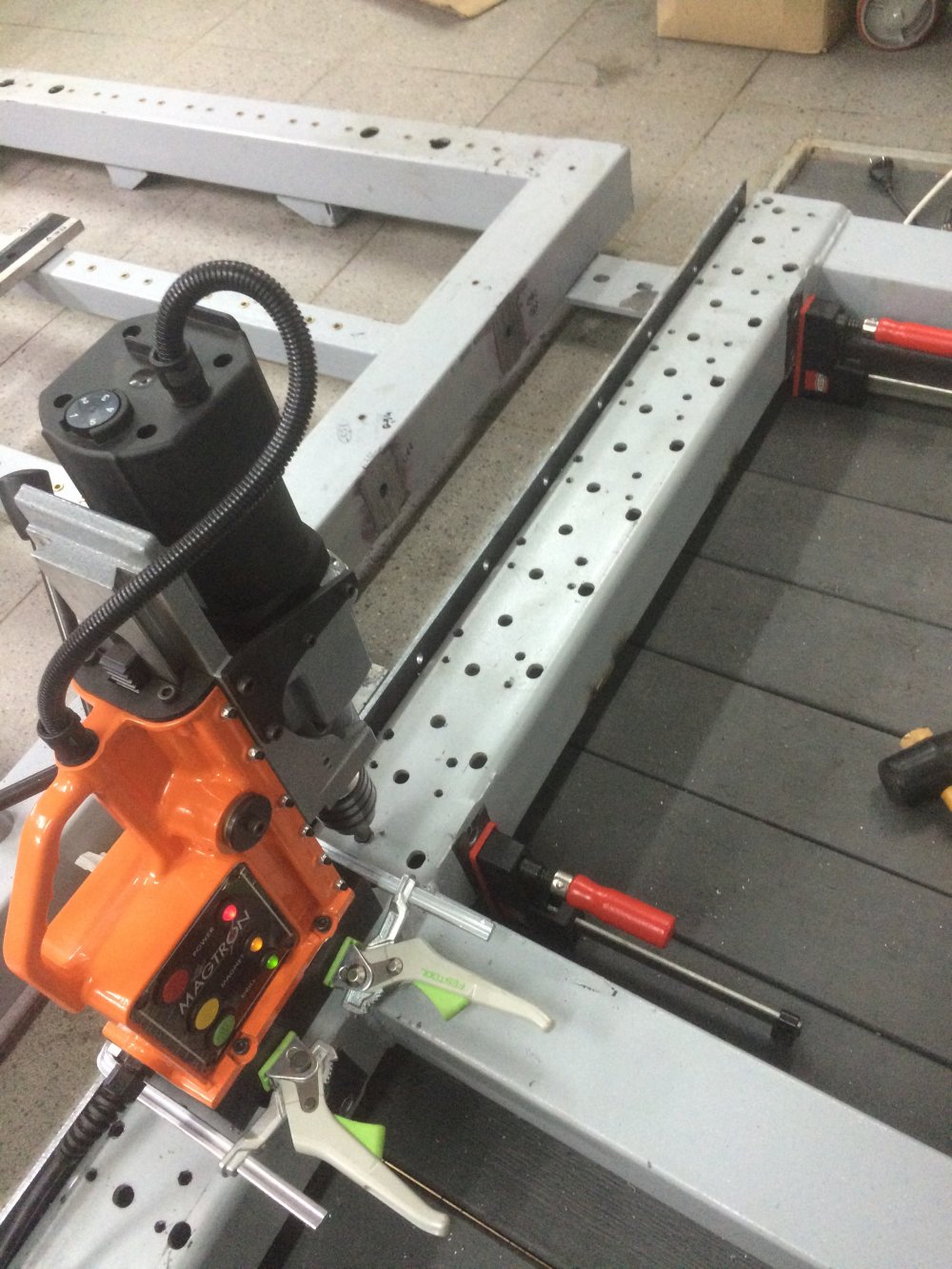 Один ряд рассверлил фрезой сверлильным станком на магнитном основании, хоть и не предназначен он для фрезеровки.