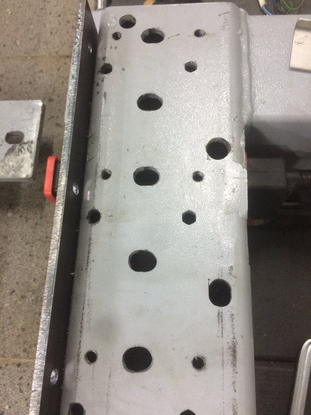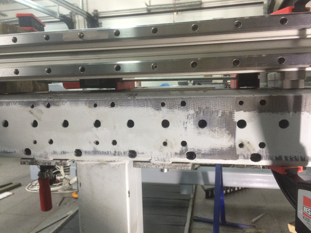 Обнаружил, что на одной балке отверстия, в которые должны проходить концы болтов, которыми крепятся рельсы и рейки, сделаны по диагонали. Смещение 6мм.