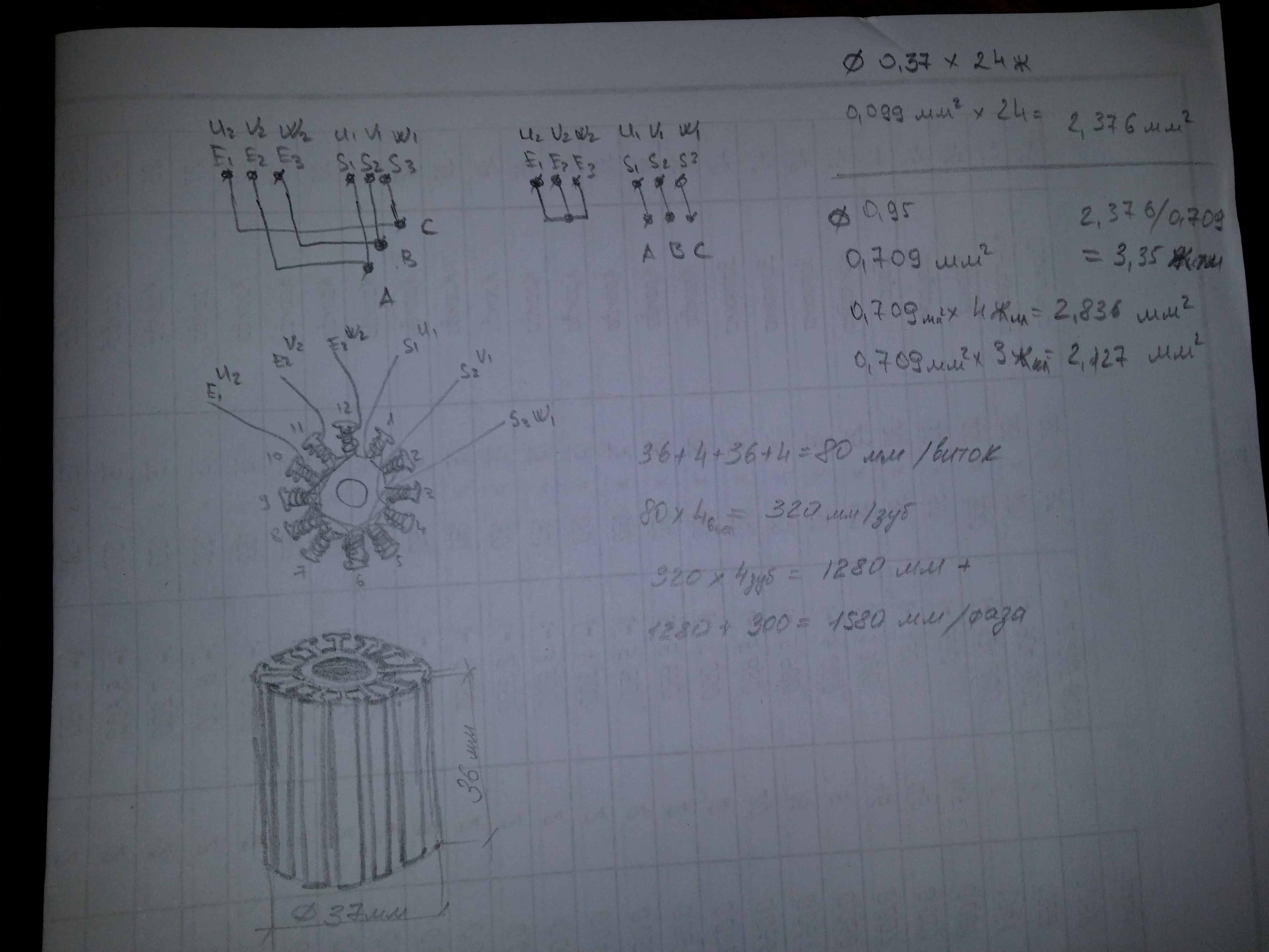 Этот двигатель имеет всего 2 витка на зуб, провод диаметром 0,37 (ближайший к нему 0,355) в 24 жилы..