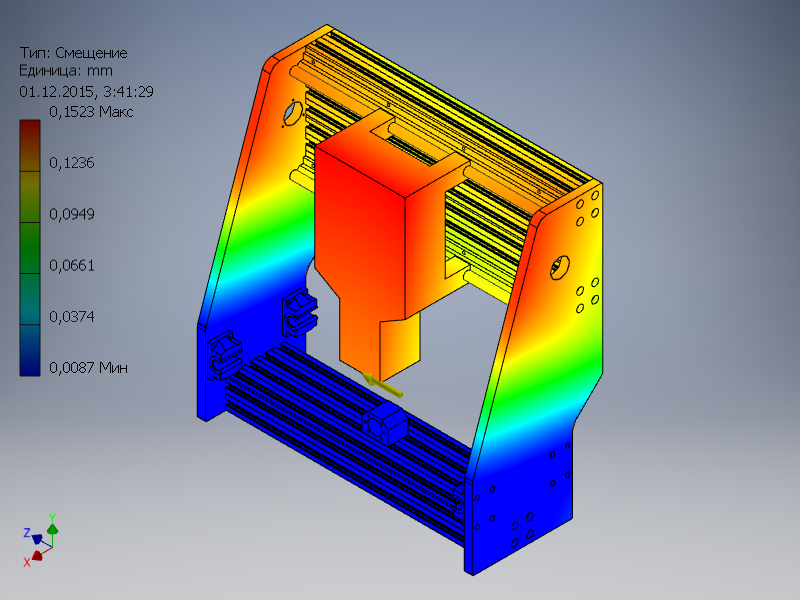 Ну вот картинка, когда шпиндель находится в крайнем положении, и портал закручивает винтом. Про этот перекос речь?AVK74 писал(а):И если Y будет в крайнем положении то появится некислый разворачивающий момент. Это же элементарный сопромат да термех.
