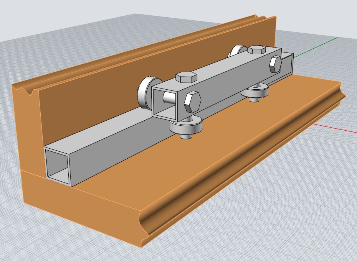 внутренняя часть удерживается за счет прижима подшипниками. Основное преимущество данной схемы состоит в том, что внутренность рельсы заполнена материалом (хоть и не железом, но все равно лучше воздуха). Таким образом длинная рельса не будет прогибаться за счет сжатия кареткой. точнее прогибаться будет, но равномерно по всей длине, а это главное ;)!