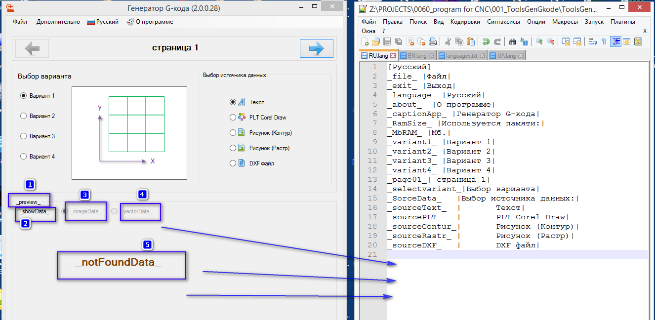 коды полей обрамлены символом "_", а разделение между кодом поля и переводом на нужном языке вертикальной чертой.