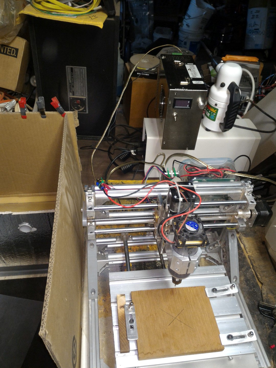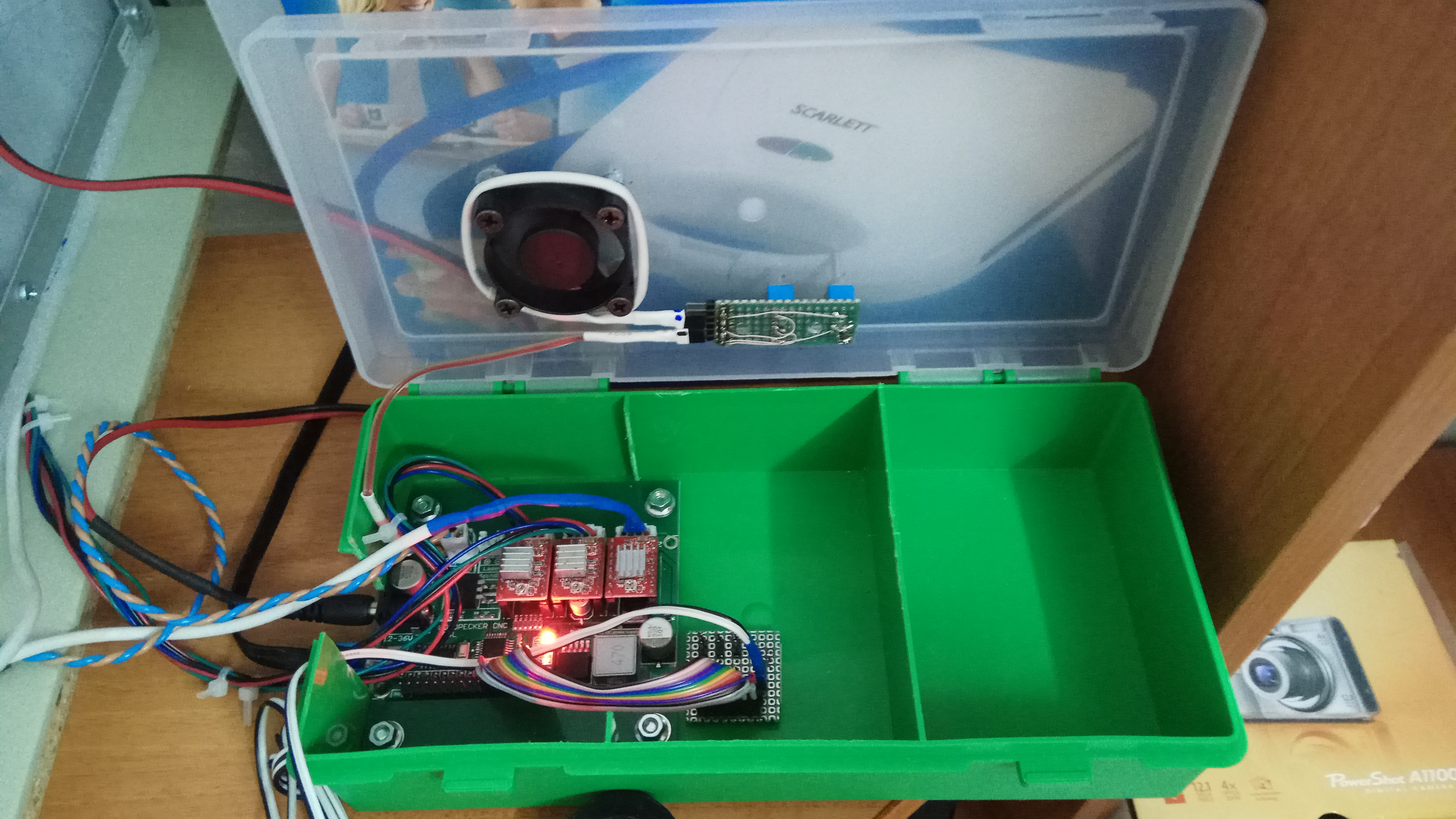 Ну и о коробке. Ее цель убрать шум. С задачей справляется плохо! Шум конечно давит, но не сильно. Из прочитанных в форумах (к примеру http://www.cnc-club.ru/forum/viewtopic.php?f=3&t=6397), думаю, и хорошо поможет только весьма толстая и тяжелая конструкция коробки. Не в сравнении моей. Но там возникают сразу еще вопросы: