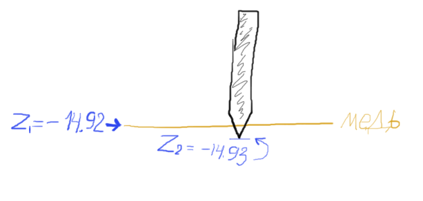 где z1 - координаты, в которых произошло касание, а z2 - координаты где остановилось движение, т.е. в течение времени реакции на касание станок успевает пробежаться, а при первом сканировании на большей скорости 100 мм/мин разница достигает 0,05 - 0,08 мм, т.е. сломать испортить сверло можно легко.