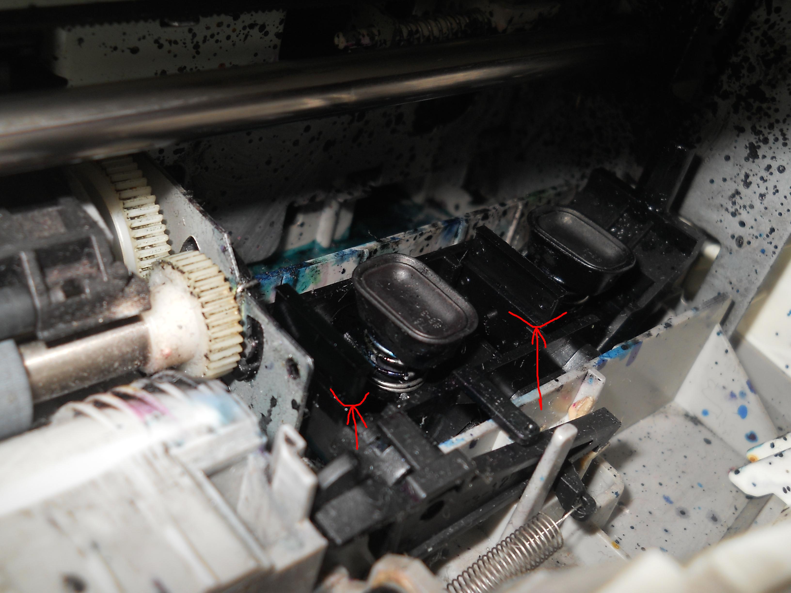 Это не ракель, а некая ванна, в которую принтер может слить чернила, использованные для промывки. Резина там бывает, но для герметизации, чтобы в выключенном состоянии сопла были герметично закрыты и не сохли, Воздух в голове - это великое зло. Ракели никакие недопустимы - они размажут чернила по соплам и чужой цвет попадёт не в те сопла.