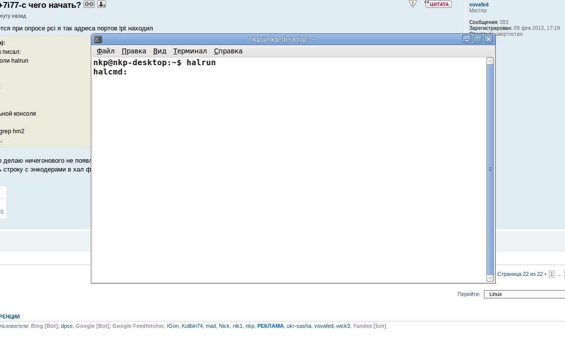 добрался до компа наконец поставил Linux-cnc поновее ввел все по порядку в терминалы и процесс пошел :D