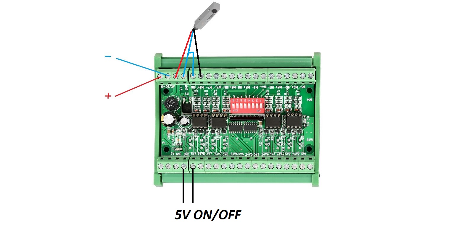 Сдается мне что платка до того универсальная ,что спасу нет и надобно сильно опутать ее проводами чтоб заработала . Если подключаем датчик пнп то его сигнальный (черный )провод лепим на in+ а соответствующий этому-же входу in- отдельным проводком подключаем к минусу (gnd) ( так как сдается мне , что оба входа оптопары попросту в воздухе "висят")