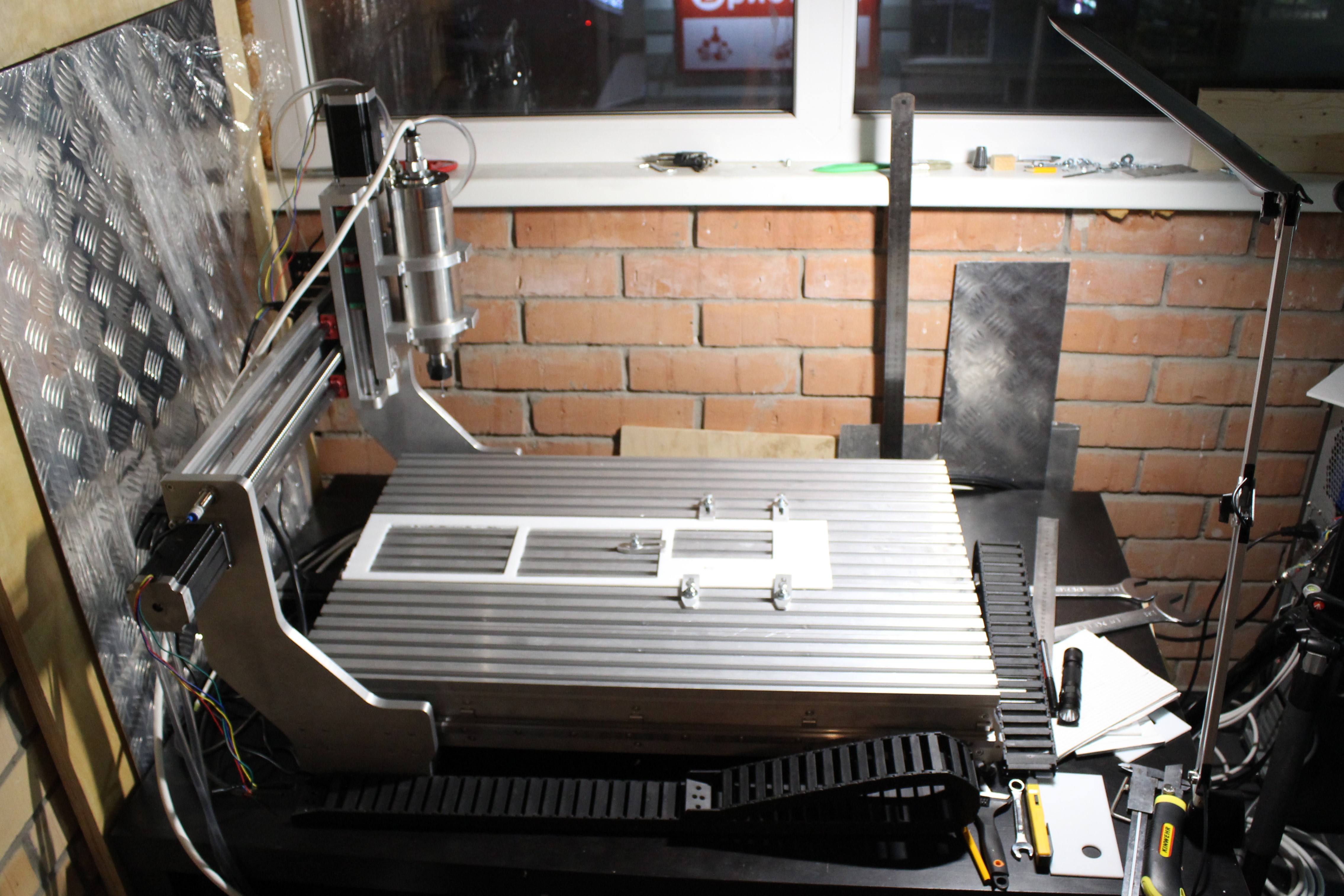 Вот так оно выглядит в станке, прикрученное к нижним отверстиям для крепления дешевого шпинделя, которые не используются для больших шпинделей. 3 см дают достаточную свободу для подгонки под разные длины фрез.
