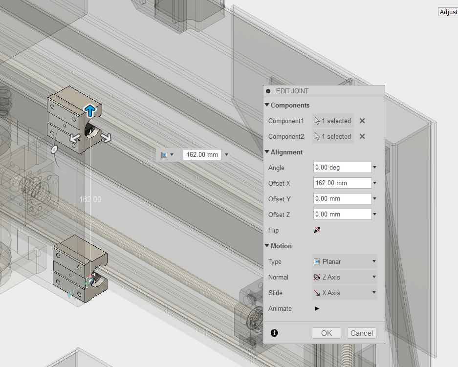 Соединение (Joint) = параметрическая зависимость. Вот, к примеру, я выбрал 2 торцевые грани двух разных кареток. Тип зависимости - плоскостная (Planar). Указал смещение. И готово.