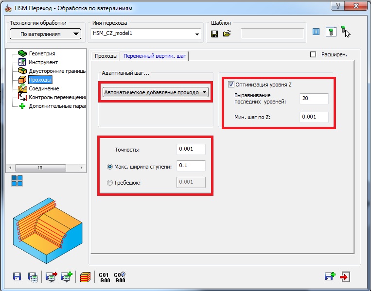 Детальку сделал с карманом с перепадом высоты 1мм: При построении по переходу 3D HSM и изменении параметров (красным) получил разую точность выполнения уклона: