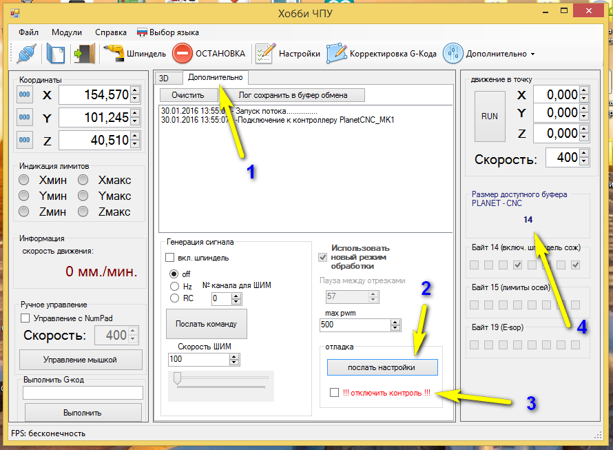 а при установлении флага "!!! отключить контроль !!!" и нажатии на кнопку послать настройки возникает число 14 в поле "размер доступного буфера"