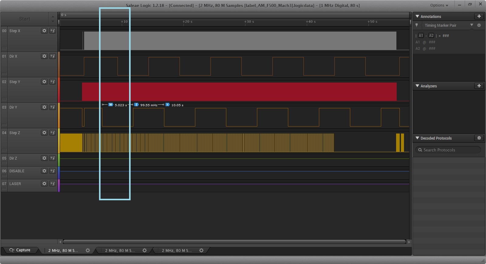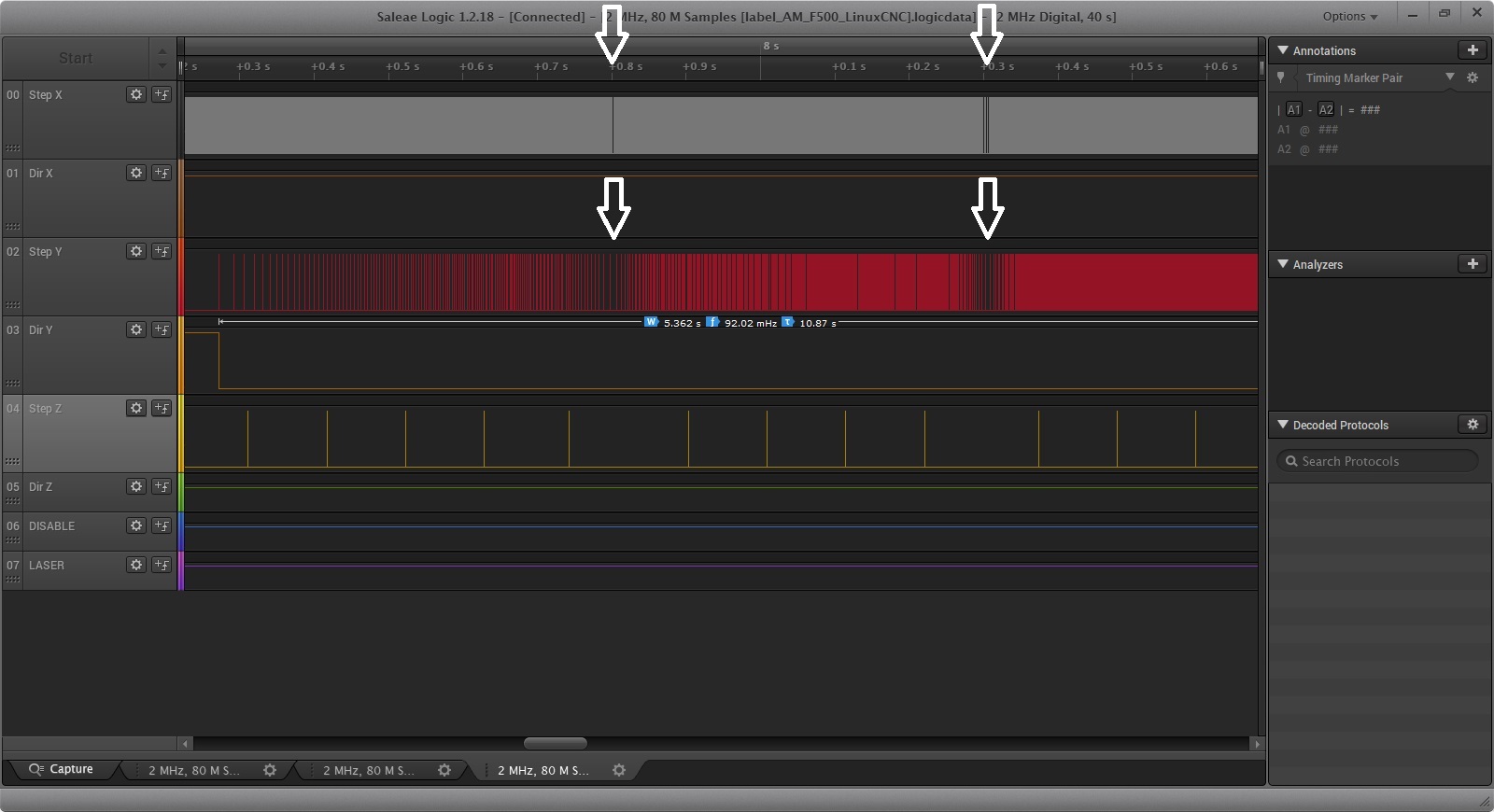 Для сравнения график выполнения той же УП на Mach3. Обратите внимание, что кроме ровных гребенок сигналов StepX и StepY, сигналы StepZ на этом графике расположены с идеально равными интервалами (я замерял средствами анализатора).