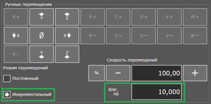Вам необходимо выбрать инкрементальный режим перемещений и указать шаг перемещений. Тогда при каждом нажатии кнопки ручных перемещений будет производится перемещение на заданную величину.Morze писал(а):И еще один вопрос: как можно с клавиатуры делать перемещение по осям на заданное расстояние? Например: перемещение на 1мм, 0.1мм, 0.01мм? Есть ручные перемещения. Жмякаю мышкой по кнопкам и выбираю проценты. Но мне кажется, для поиска нуля удобнее было бы например перемещаться с дискретностью 0.01мм.