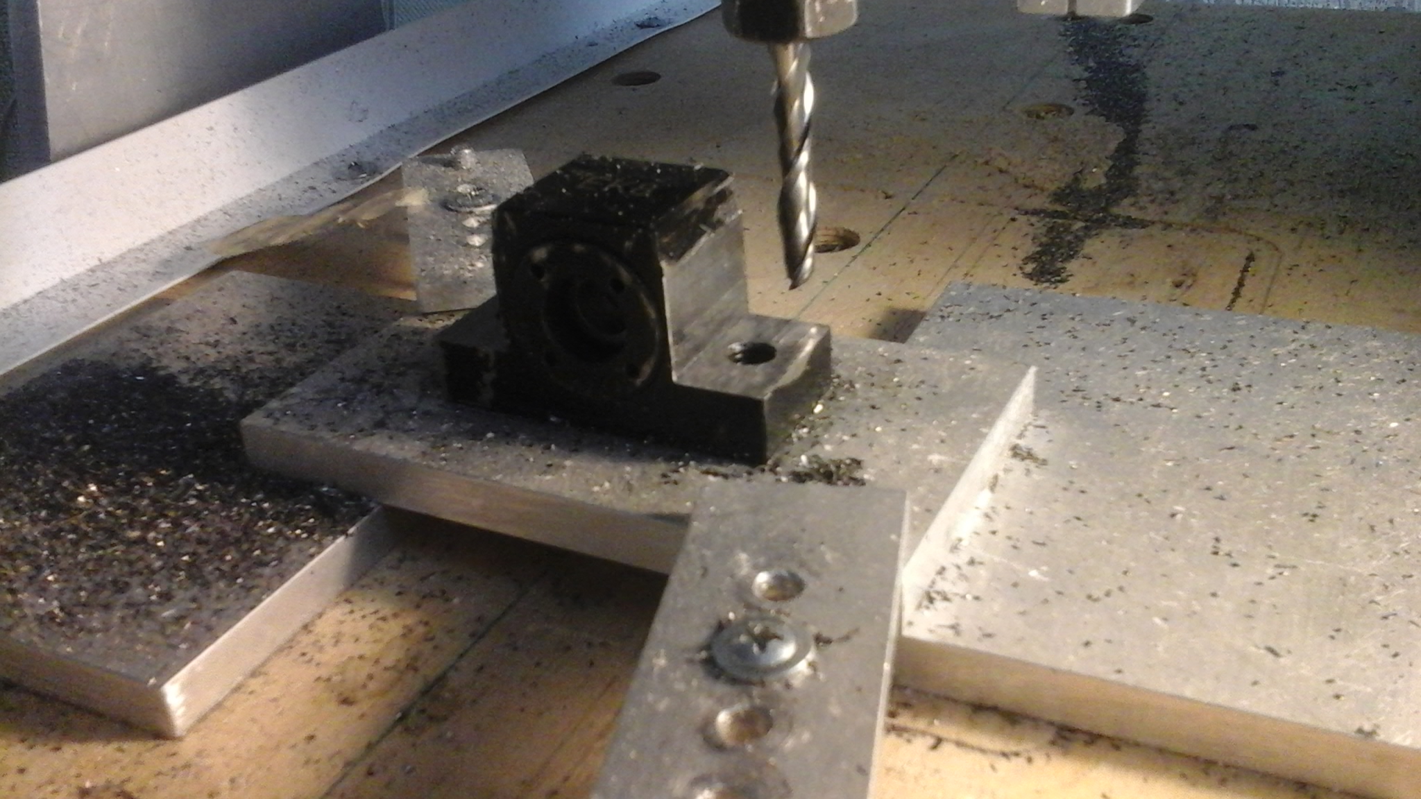 Вот и какую-то сталюку попилил. Это упорный узел ЕК-8 для оси Z, там надо было убирать лишний металл для компактной сборки. Раньше эту операцию выполнял на стороне, но теперь это сделал на своем станке. Фреза какой-то "ноунэйм" диаметром 6мм, шпиндель 1.5квт, фрезеровал вручную ручками станка.