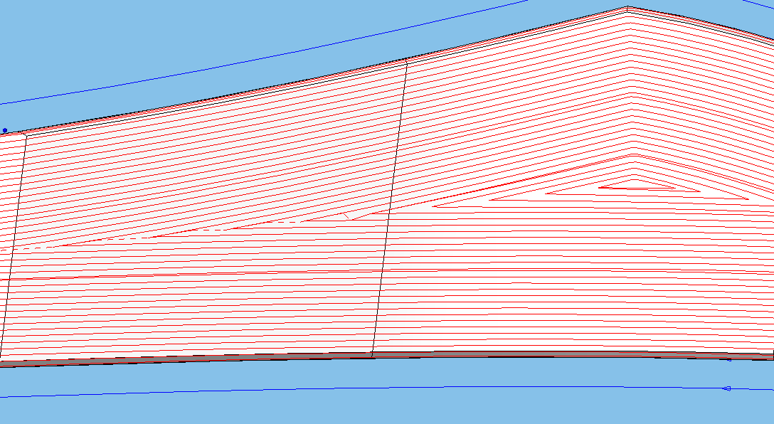 Траектория получается смещением на шаг инструмента от внешнего контура, а поскольку деталь имеет несимметричную форму(где-то уже, где-то шире) то когда смещение пересекает само себя оно обрезается алгоритмом CAM чтобы не резать воздух, фреза поднимается и опускается в новом месте, вот это пересоединение траектории похоже на то что фреза вибрировала в этом месте.