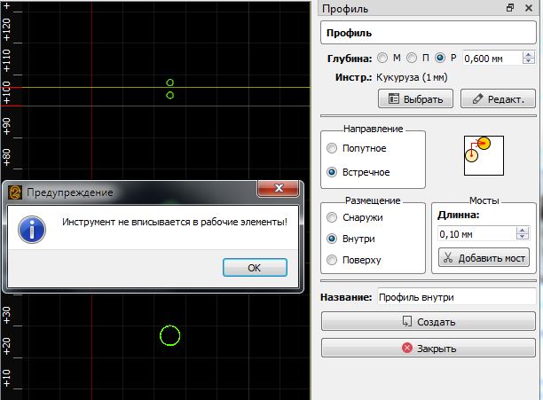 Подскажите, пытаюсь вырезать 2 отверстия 2 мм и 2 отверстия 6 мм "кукурузой" - 1 мм. Получаю сообщение: "инструмент не вписывается в рабочие элементы"