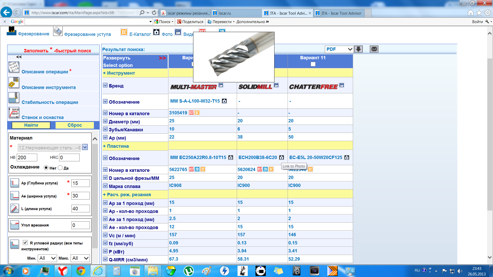 В твоем каталоге есть мощность шпинделя, вот и смотри на свою мошь шпинделя. Ты видео на ютубе насмотрелся и хочешь так же. Только там и станина мощная которая не дает фрезе вибрировать и дергаться что позволяет иметь всегда одинаковый съем на зуб и мощность шпинделя 15квт которую твои квартирные розетки не выдержат.