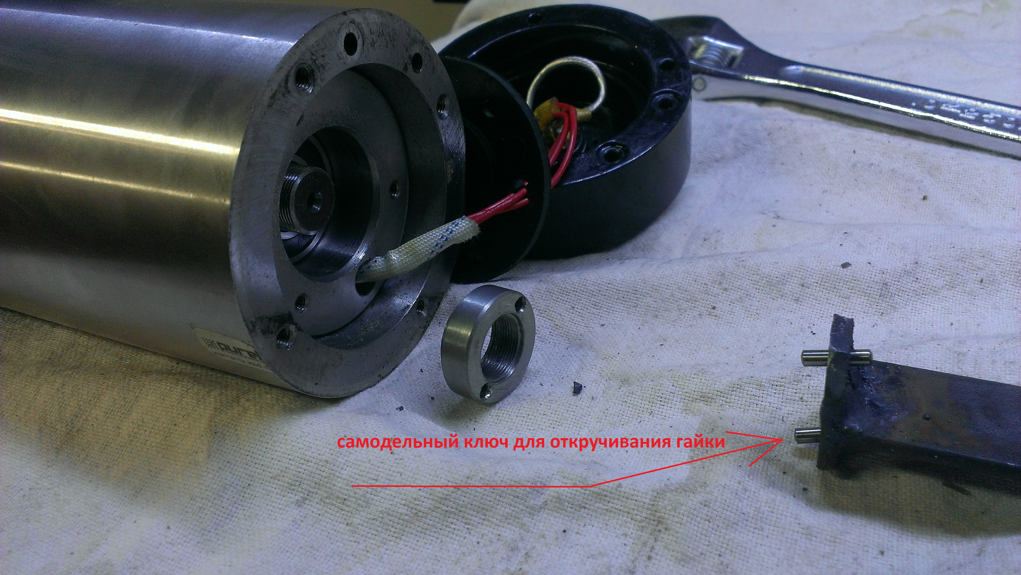 1. Сделал ключ как рекомендовали с 4 штырями: 2. взял ключ (которым откручиваю цанги) и самодельный со штырями. ухватился обоими за вал и открутил самую нижнюю гайку. гайка по резьбе чем-то типо лака обмазана. идет туго но от усилий руки. 3.Открутил верхнюю крышку 4. открутил пыльник под ней 5.сделал самодельный ключ для откручивания гайки. она имеет ЛЕВУЮ резьбу. и открутил ее держась за нижнюю часть ротора ключем. 6.открутил весь нижний крепеж. неснятая полностью гайка не мешает этому процессу. 7.немного отодвинул шайбу (где сидят нижние подшипники). для этого в ней есть два отверстия с резьбой м5 после чего ротор вышел без каких либо особых усилий.
