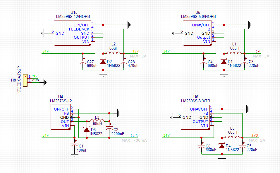 В данный момент, чтобы сильно над питанием не сидеть, нарисовал вот так. Если где-то видны ошибки, не стесняйтесь. Скажу только, что для каждой группы устройств на плате будет своя доп. обвязка с фильтрами. Ближе к концу рисования, когда посчитаю потребление с каждой линии, можно будет заняться переосмыслением и тюнингом.
