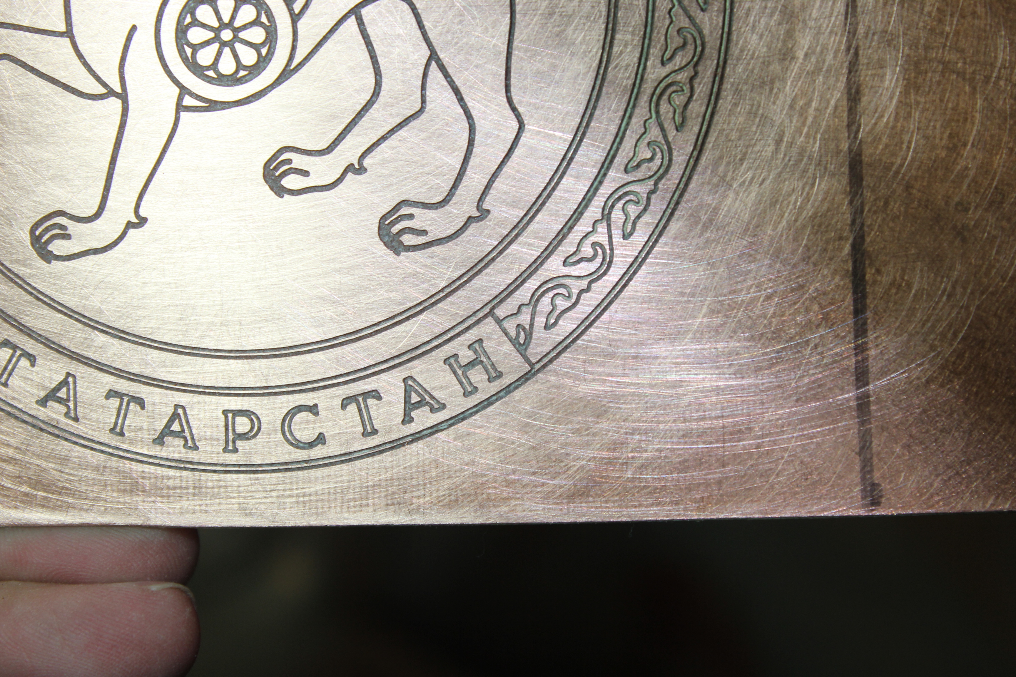 Ну и другие лаги, связанные с неравномерным прижимом, и с тем, что заготовка, видимо, сдвинулась в процессе обработки - орнамент вырезался в первую очередь (в самом начале - внешняя окружность), а буквы и их рамка - в последнюю. Правая сторона рамки сдвинута вниз, левая - вверх. Но это ладно, интересно, почему такая погрешность в диаметре на текстолите? :shock: Да, зажимал за внешние углы.