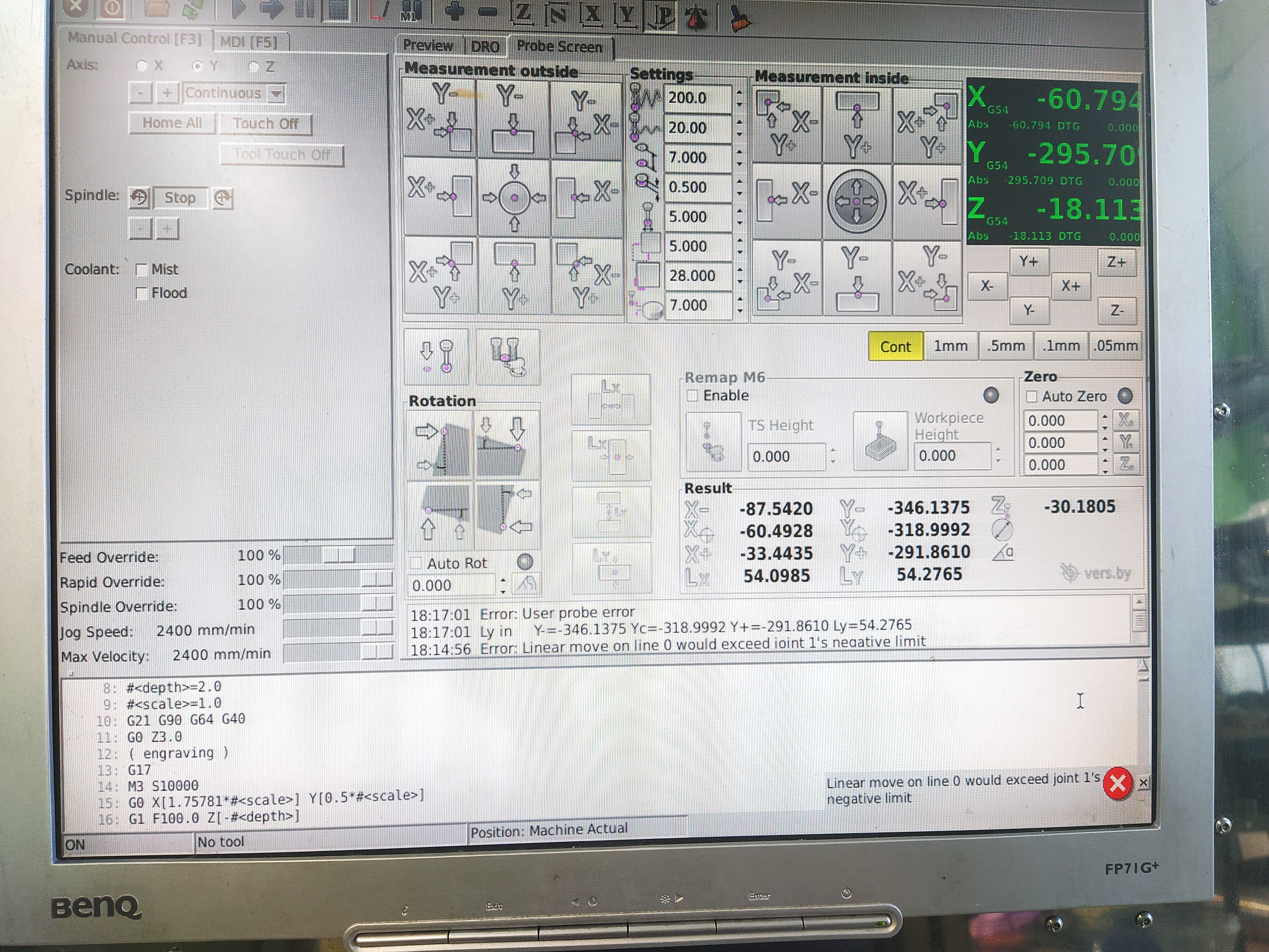 станок движется щупом вниз (Y-) , касается, движется вверх, касается и залипает с ошибкой (Error: Linear move on line 0 would exceed joint 1 negative limit) До концевиков далеко, отверстие 54мм. По оси Х те же ошибки. В чем может быть проблема?