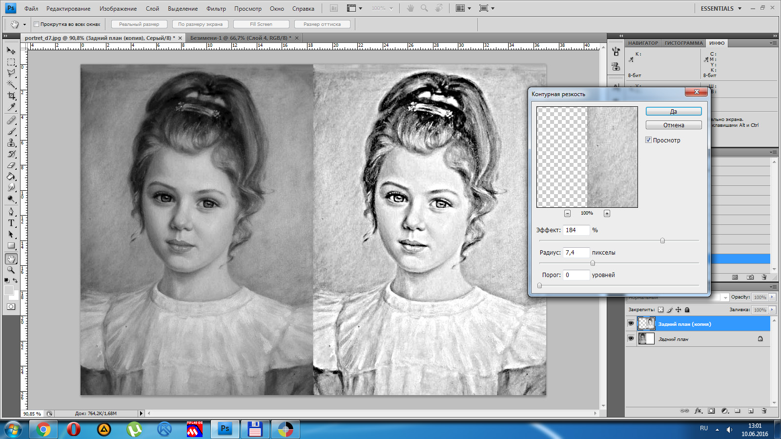 Ну и на вкус и цвет фломастеры разные, поэтому вышеуказанные настройки не являются эталоном, они будут совсем не такие на другом портрете, например чем больше исходное разрешение, тем больший радиус нужно указывать в окне резкости, поэтому придётся поэкспериментировать.