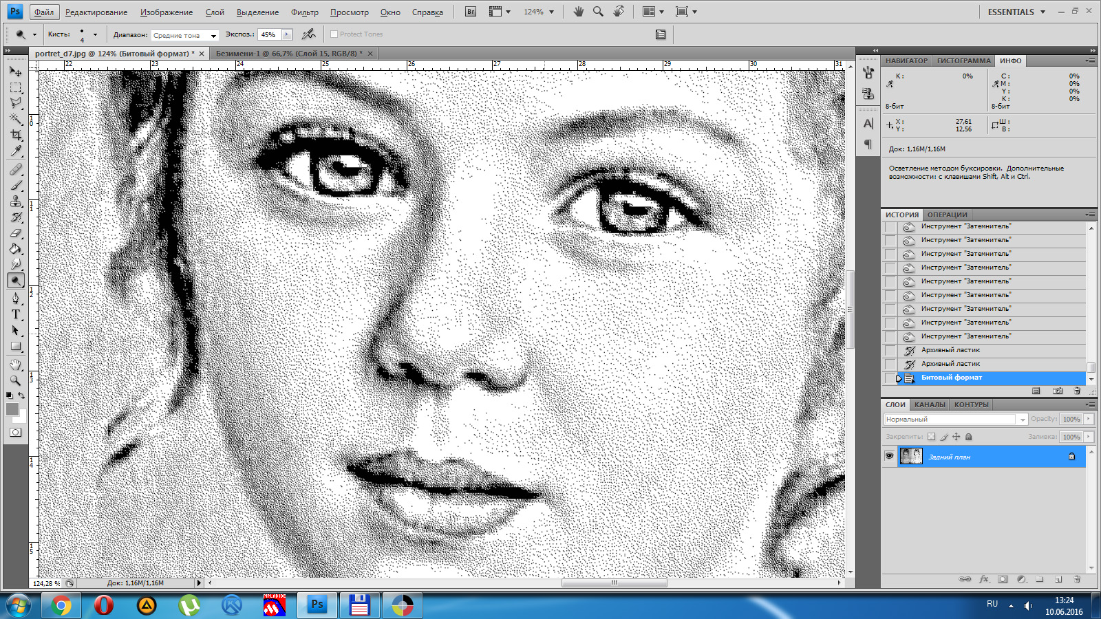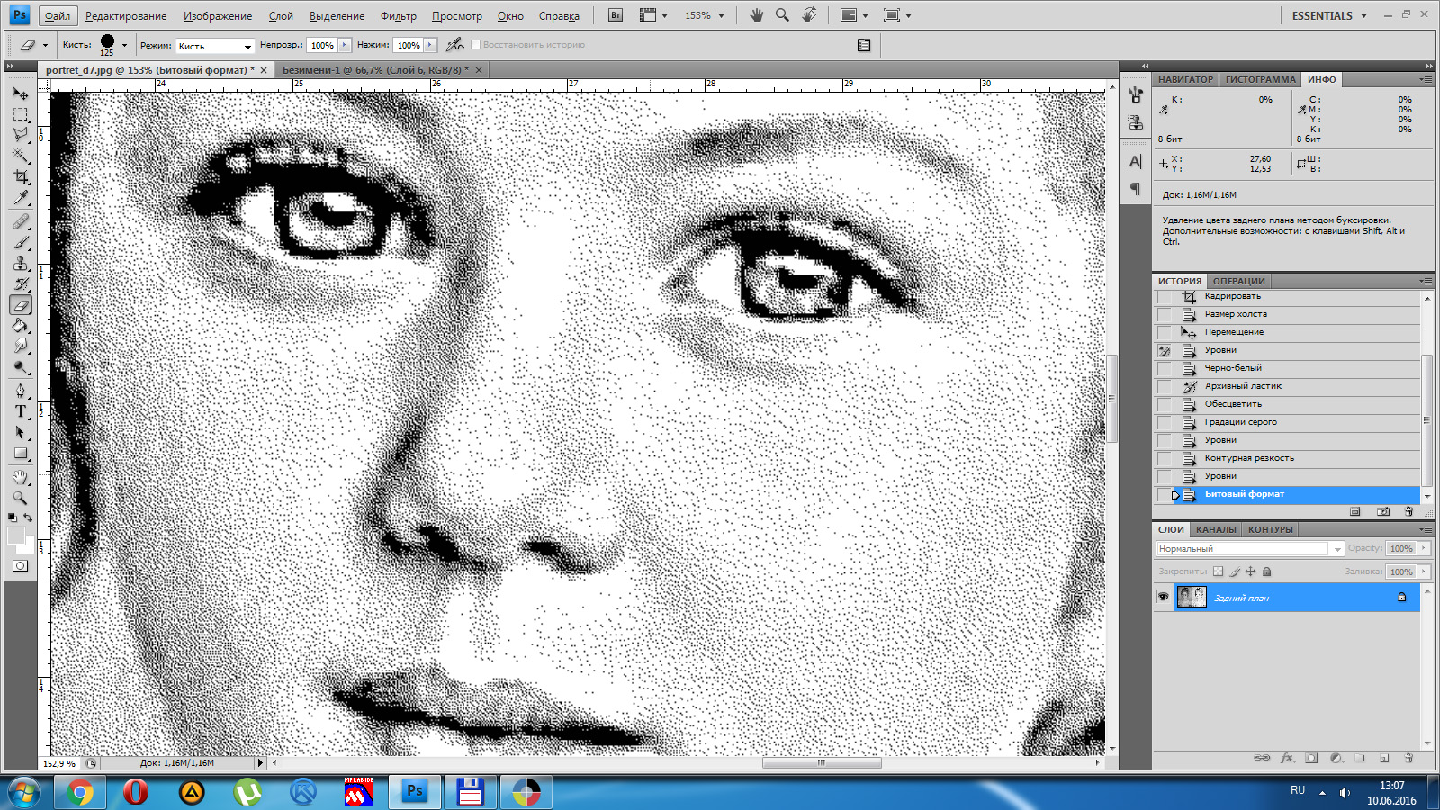 6 - Изображение - Режим -Битовый формат. Для гравировки с шагом 0,1 выбираем значение выхода 100 пикс/см., Метод - случайный дизеринг (тут можно экспериментировать, например сделать полутоновой растр, как в LaserCAD, только алгоритм преобразования в фотошопе лучше)