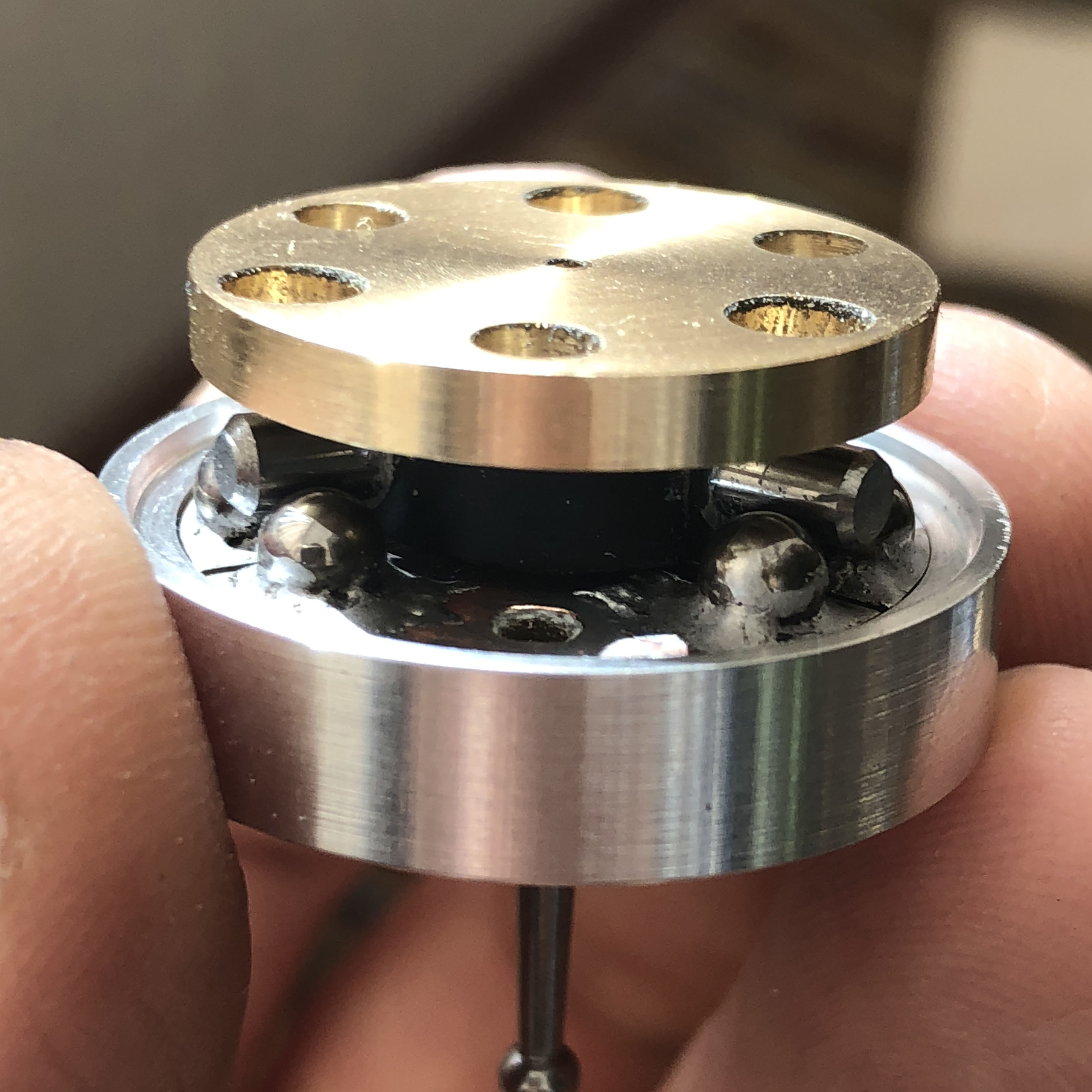 Да, зачетненько вышло. Верхняя крышка вытачивалась вместе с валом? Внутри вижу латунное кольцо. Раскажи о конструкции внутри, как штырьки располагал?