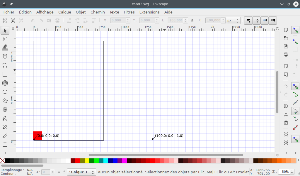 The red square at the bottom is 100x100px. As you can see, the orientation points are quite... BIG, a lot bigger than the document itself. And the point along X axis where the point (100.0,0.0) is does not look to be placed according to some logical value. X=1333px exactly.