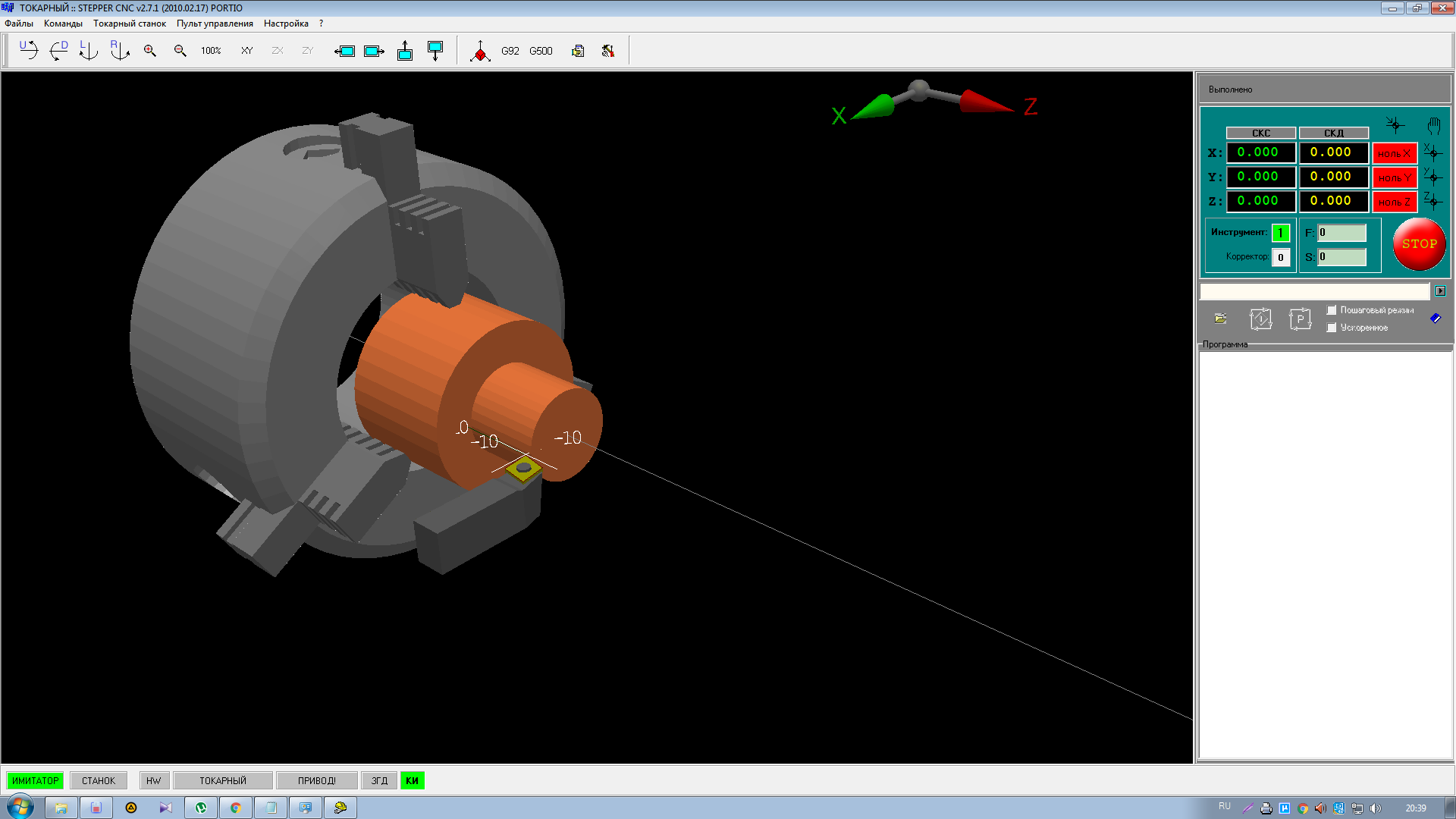 вот такой симулятор там,не знаю,но ничего похожего в интернете я не видел.здесь я выкладыва программу которую списал у соседа.но почему то у меня она тоже не работает(в моей версии симулятора как то по другому всё)там в классе инструмент позади детали работает и вращение по часовой стрелке.ещё и в относительной системе препод программы писать задаёт