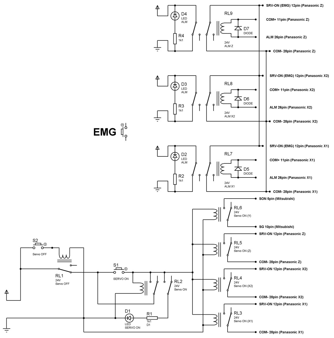 Как бы это все безобразие подключить чтобы при отключении обмотки (появление ошибки привода) реле (например, ось X1) включается светодиод D2 и рвется сигнал SRV-ON (при настройке в усилке разрыв SRV-ON = EMG и мотор становится как вкопанный), но этот же сигнал (вернее его отсутствие) рвало и др. линии SRV-ON. При этом светодиод оставался быть включен именно на том приводе, на котором и была ошибка. Как? Спасибо.