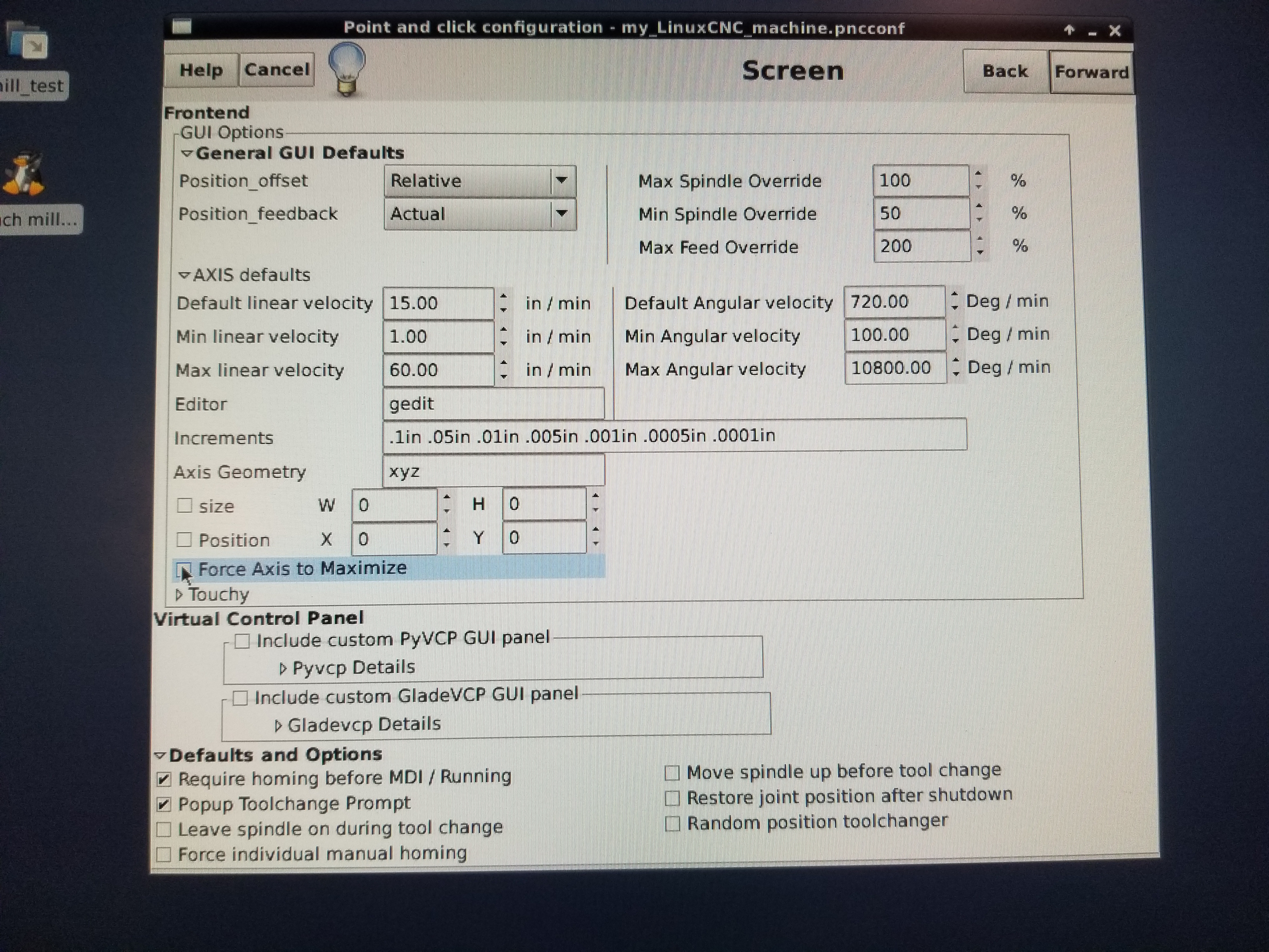 По сабжу: простой способ, но работат только с Pncconf. В настройках AXIS defaults поставить галочку на Force Axis to maximize