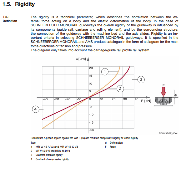Тоже долго искал кто же из производителей не постесняется выложить эти данные, в наиболее полном объеме нашел их только у швейцарской SCHNEEBERGER, указана даже зависимость жесткости от класса и кол-ва винтов крепления каретки. Есть данные по жесткости в разных плоскостях, можно даже сравнить роликовые и шариковые каретки между собой, вообщем рекомендую.a321 писал(а):А вот конкретных цифр они не публикуют.