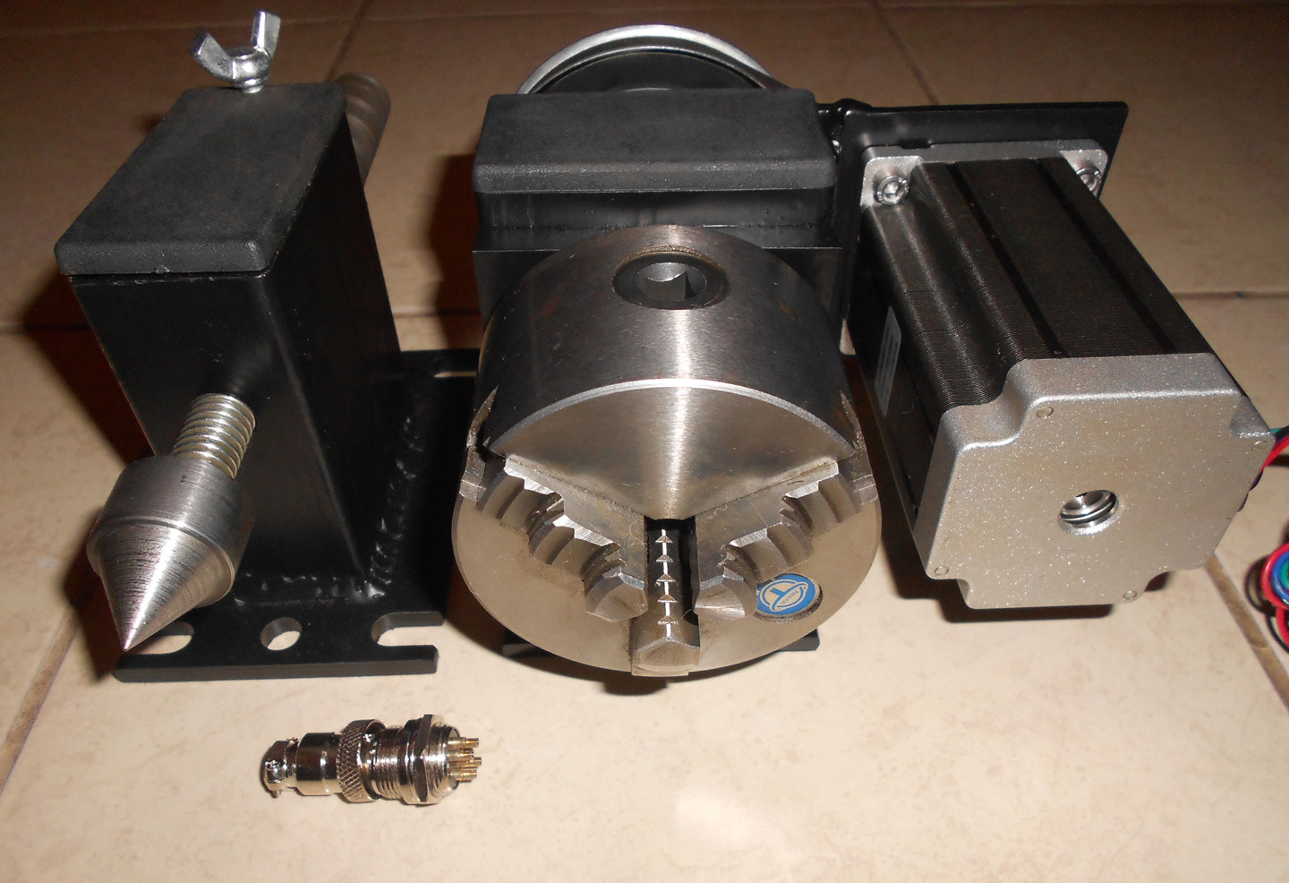 6) Поворотная ось с задней бабкой: патрон 80 мм, шаговый двигатель с моментом 40 кг*см, ток 4А, вал со сквозным отверстием 12.5мм, натяжение ремня винтом, всё выполнено из стали. В комплекте: поворотная ось, задняя бабка, ключ, разъём, обратные кулачки. Цена комплекта: 17500р.