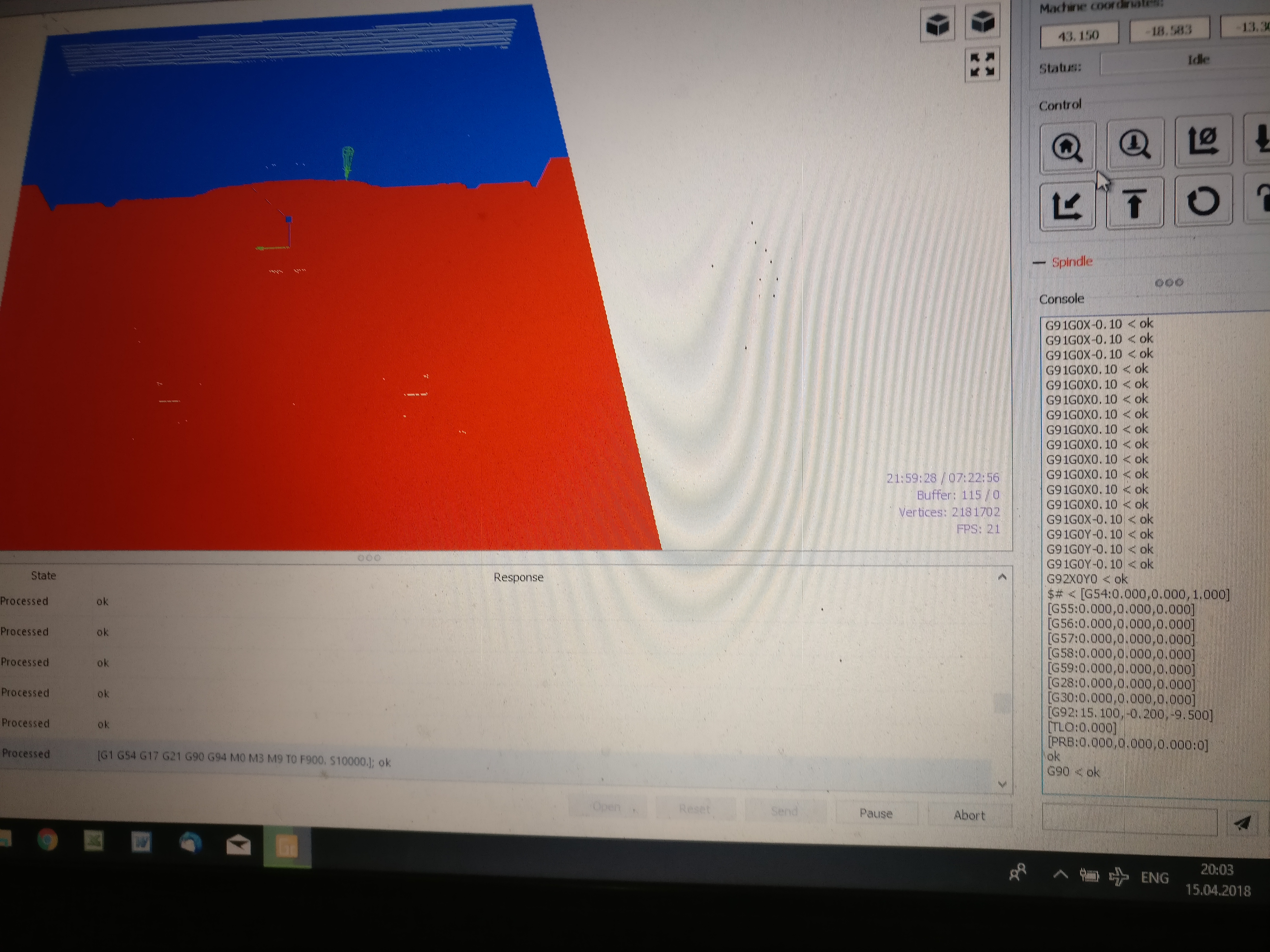 Доброго всем дня. Прошу помощи . думаю эта тема подходящяя для моей проблемы. Проблема такая , при вытачивании модели при 70-80 % пройденого пути сначала в программе Candle станок остановился с работаюшем шпинделем на одном месте, и выскачили сообщения об ошибке. затем программа просто закрылас. Тч. я не успел даже увидеть ничего толком. После этого я попробовал запустить так же в программе Candle УП только навстречу, с друго стороны. Станок дойдя до того злощастшого места сместился по оси х. (фото 1) я решил что в программе какой то глюк. стал точить заново, только в GRBL CONTROL. И опять где то на 70% выполненого обумя програма остановилась ( имено остановилась, не зависла) при этом прорезала по оси Z борозду в минус. я свотографировал то что она выдала.