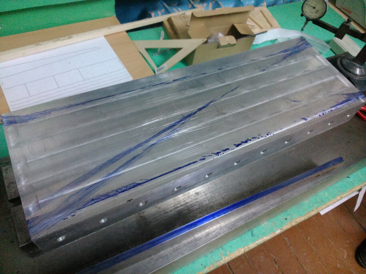 При сборке балки портала идеальной плоскости не получилось, отдал сегодня в на фрезеровку в универ. Немножко поспорили по способу базирования, предлагали прижать балку прямо к столу станка прихватами , а на счет обработки в тисках отговаривали, все же настоял попробовать обработать в тисках - опасаюсь, что иначе заготовка примет форму стола ,а после обработки снова "сыграет " и получим то же самое корыто.