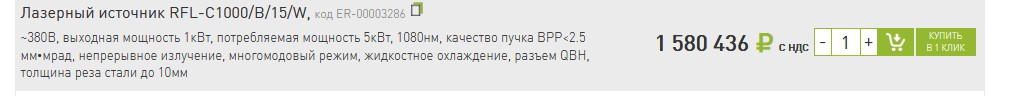 aftaev писал(а):Лазерный источник RFL-C1000/B/15/W 380В, выходная мощность 1кВт, ЦЕНА = 4 526 451 рублей = 70 068$
