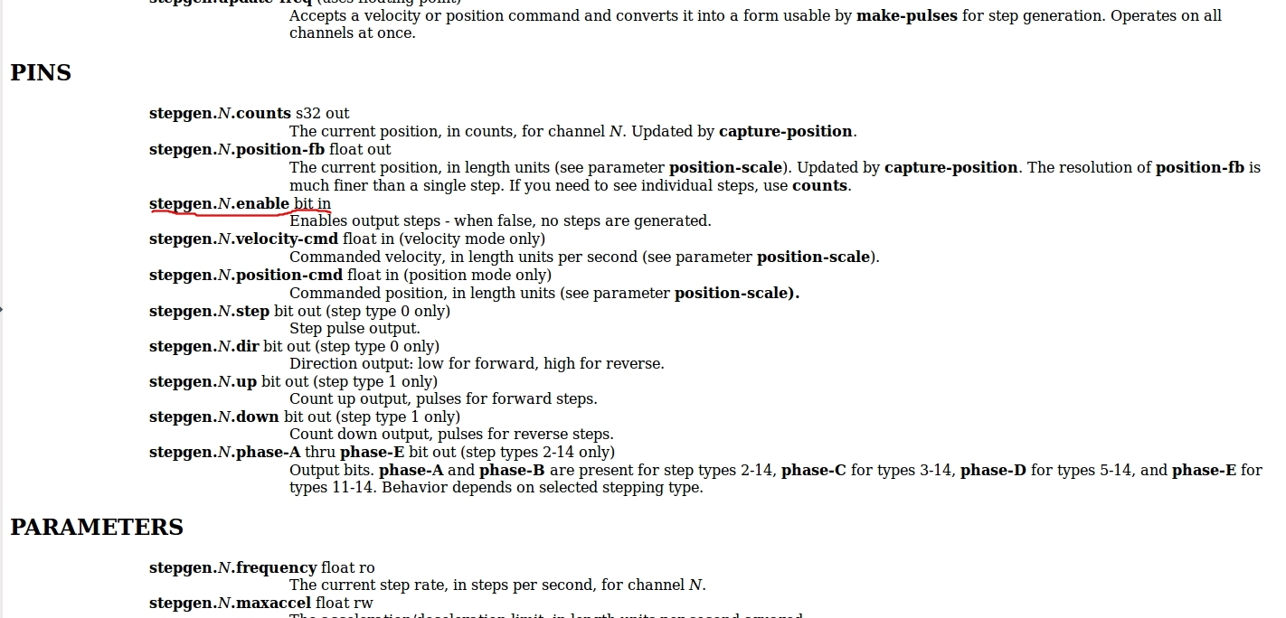 Не нашел в описании EMC2 такого. Ну нет в описании stepgen.<chan>.enable