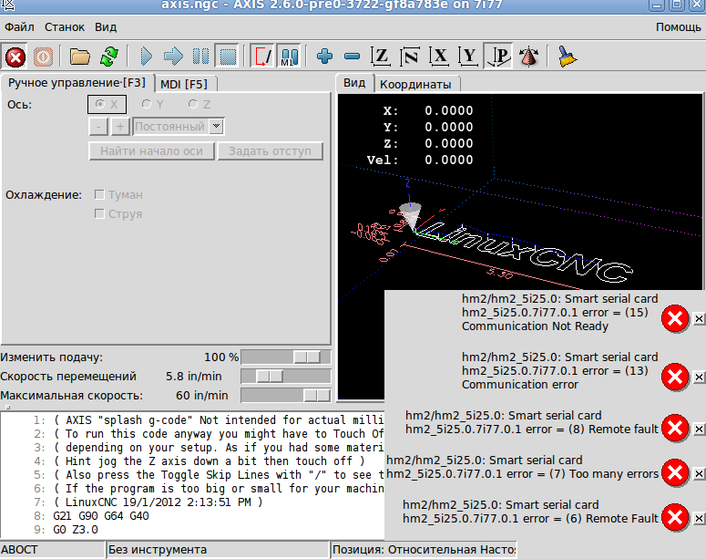 Nick писал(а):скорее всего - новая прошивка, а точнее наверное прошивка-то старая, а новый hostmot2. Раньше у него может и прокатывали не правильно заданные режимы smart-serial, а теперь - нет.