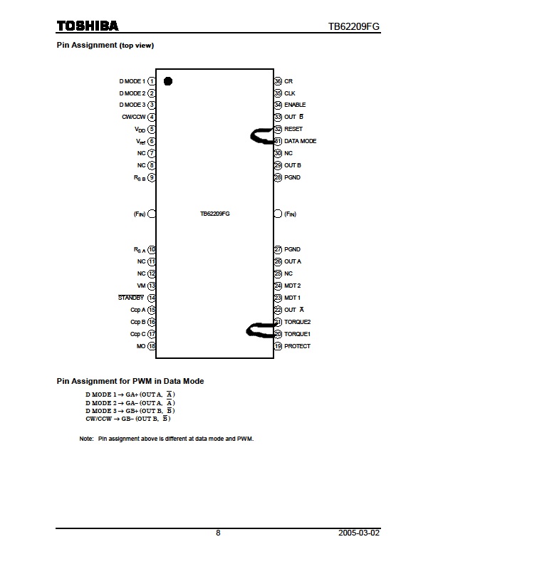 Такой вопрос, TORQUE1 и TORQUE2 (ноги20 и 21) должны быть изначально замкнуты? Просто тестером пробил по остальным осям- кз! Или ключ какой? Также Reset (нога 32 вроде) закорочена на( Fn) которая, в свою очередь масса-PGND (GND-вроде масса, что за префикс Р не знаю) Вобщем запаял, как звонилось по остальным осям, тупо, не спорю, но заработало в одну сторону! Если не сложно подскажите! Спасибо!
