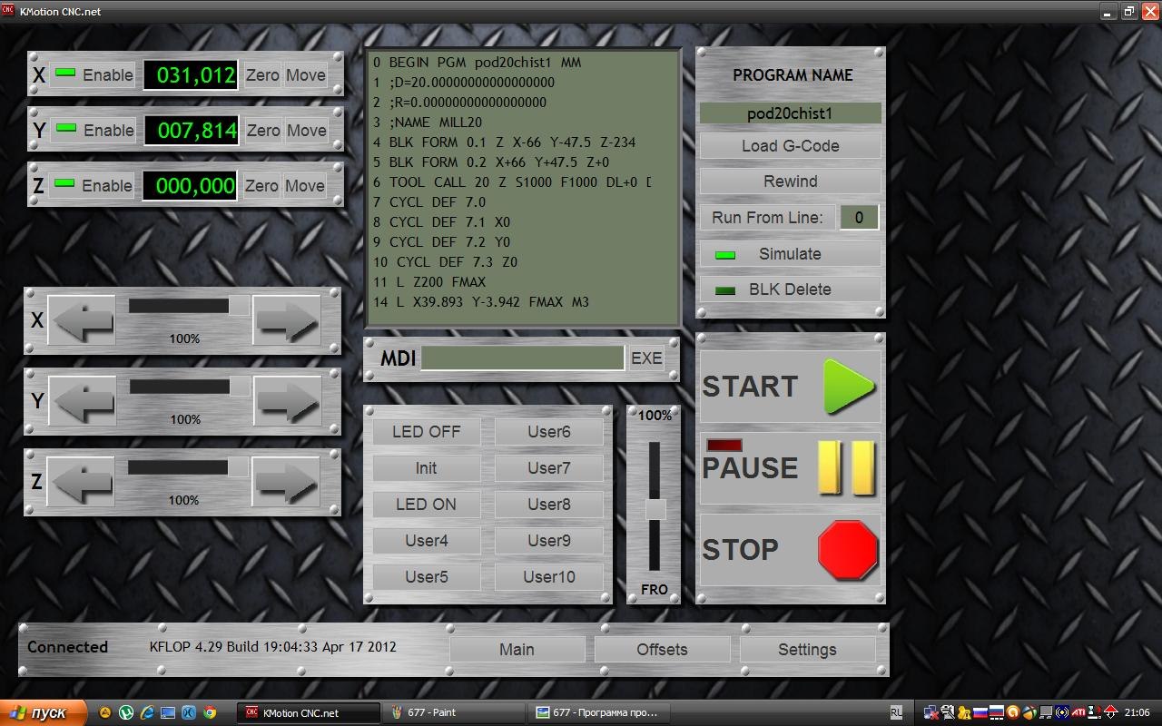Подключил КФЛОП через примерно таку платуmichael-yurov писал(а):Есть небольшие проблемы с тем, что KFlop-а уровни сигналов - 0 - 3,3 В, и нужно использовать схему согласования, или работать в режиме открытого коллектора и подключать оптопары драйверов к выходу и +5В.