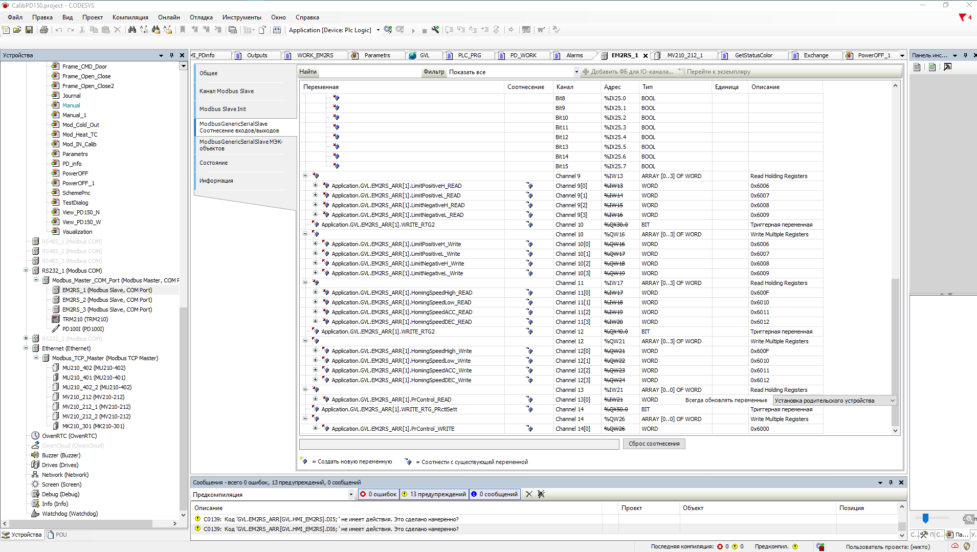 2.2. Прописал в CodeSYS Modbus COM, в нём прописал номер СОМ-порта и параметры связи.