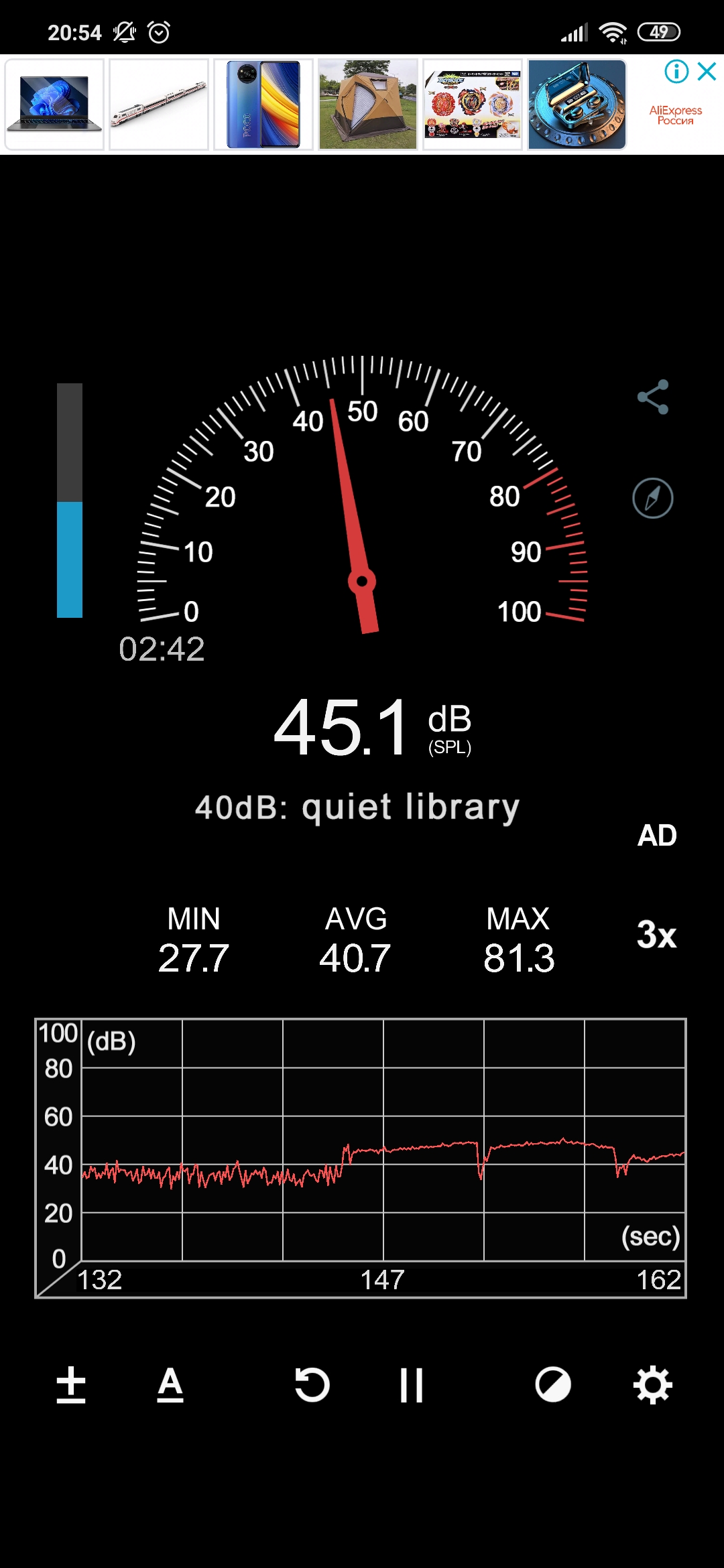 Благодарю) Как уже писал, шум гасится далеко не в ноль, но в принципе не напрягает. Шумомера нет, но вот скрины приложения на телефон.