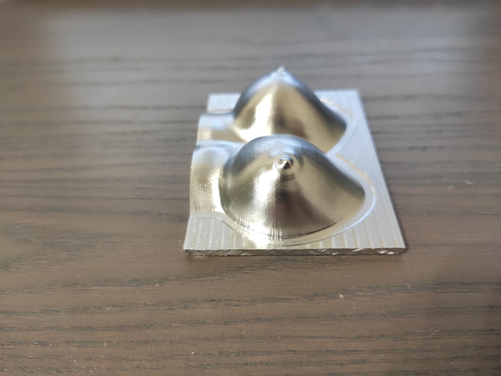 Люминиевые сиськи. Видимо, шаг 0.1 для фрезы 2.5 маловат, слишком полосато. Но полоски, которые были на оргстекле, на алюминие видны сильно меньше. Повешу их на елку)