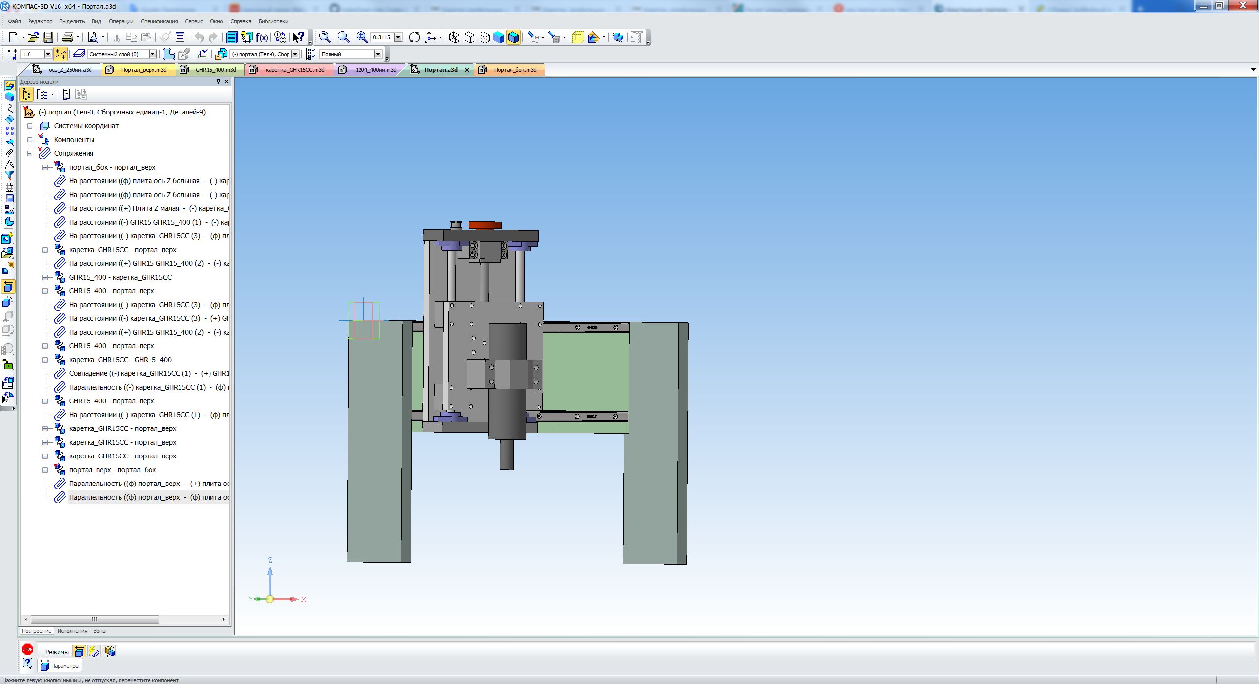 сидим дальше в компасе. портал. я честно тянул с ним, потому что не уверен на все 100 в правильности его моделирования. дело в центре тяжести. понятно что он посередине кареток оси Х... а вот где он у меня на портале...) кручу верчу...