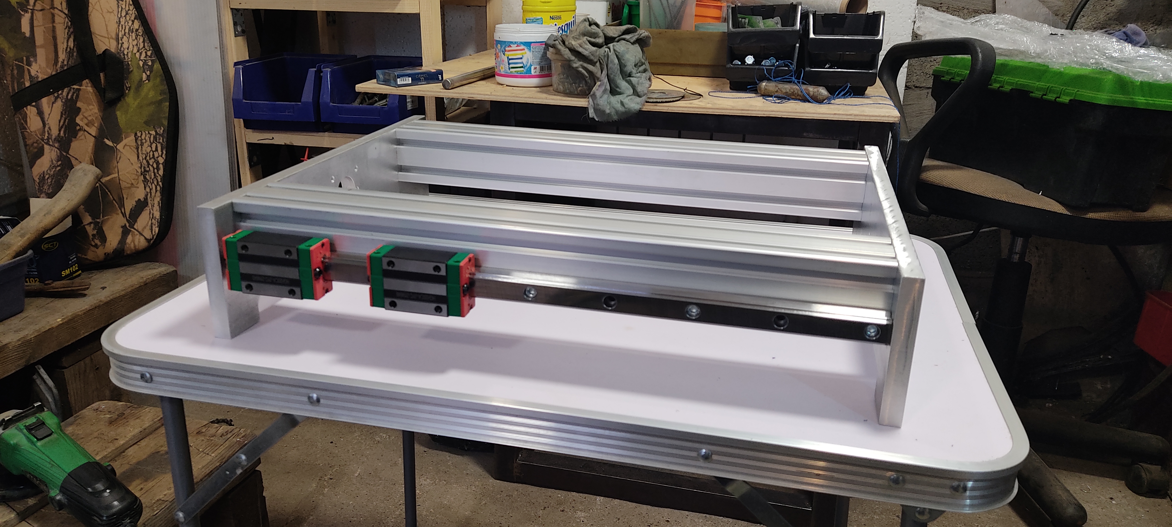 16 шт резьбы М8 в профиле 60*60 и низ основа собрана. Болты пришлось все проточить на станке, также как и болты М6 для крепления рельс к профилю. Собрал все вместе. В местах крепления портала к кареткам зазор как и планировал, лучше зазор выбрать латунной фольгой чем "не влезает")